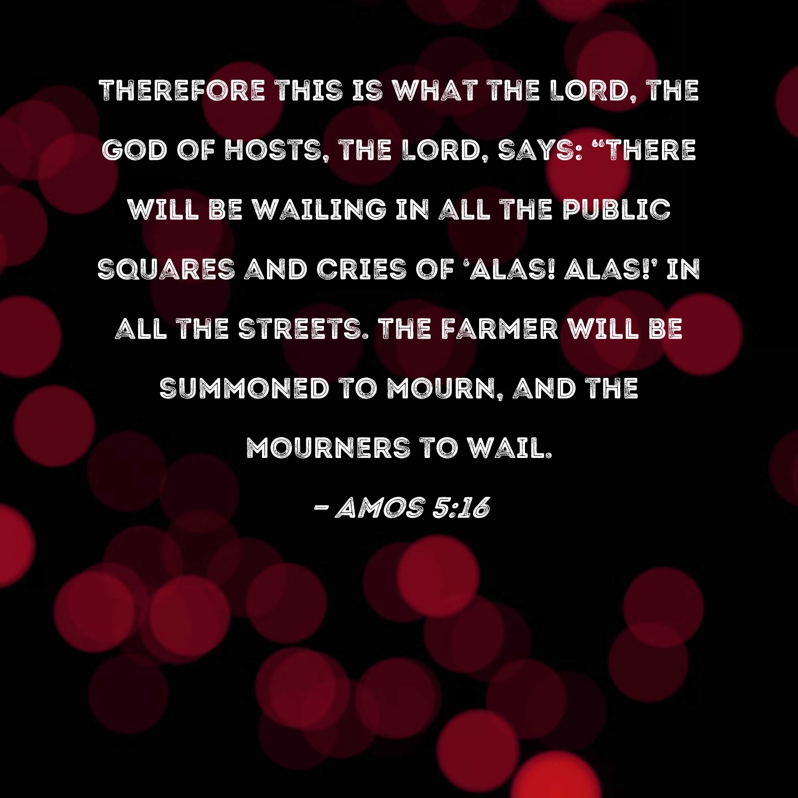 Amos 5:16 Therefore this is what the LORD, the God of Hosts, the Lord, says: "There will be wailing in all the public squares and cries of 'Alas! Alas!' in all the streets. The farmer will be summoned to mourn, and the mourners to wail.