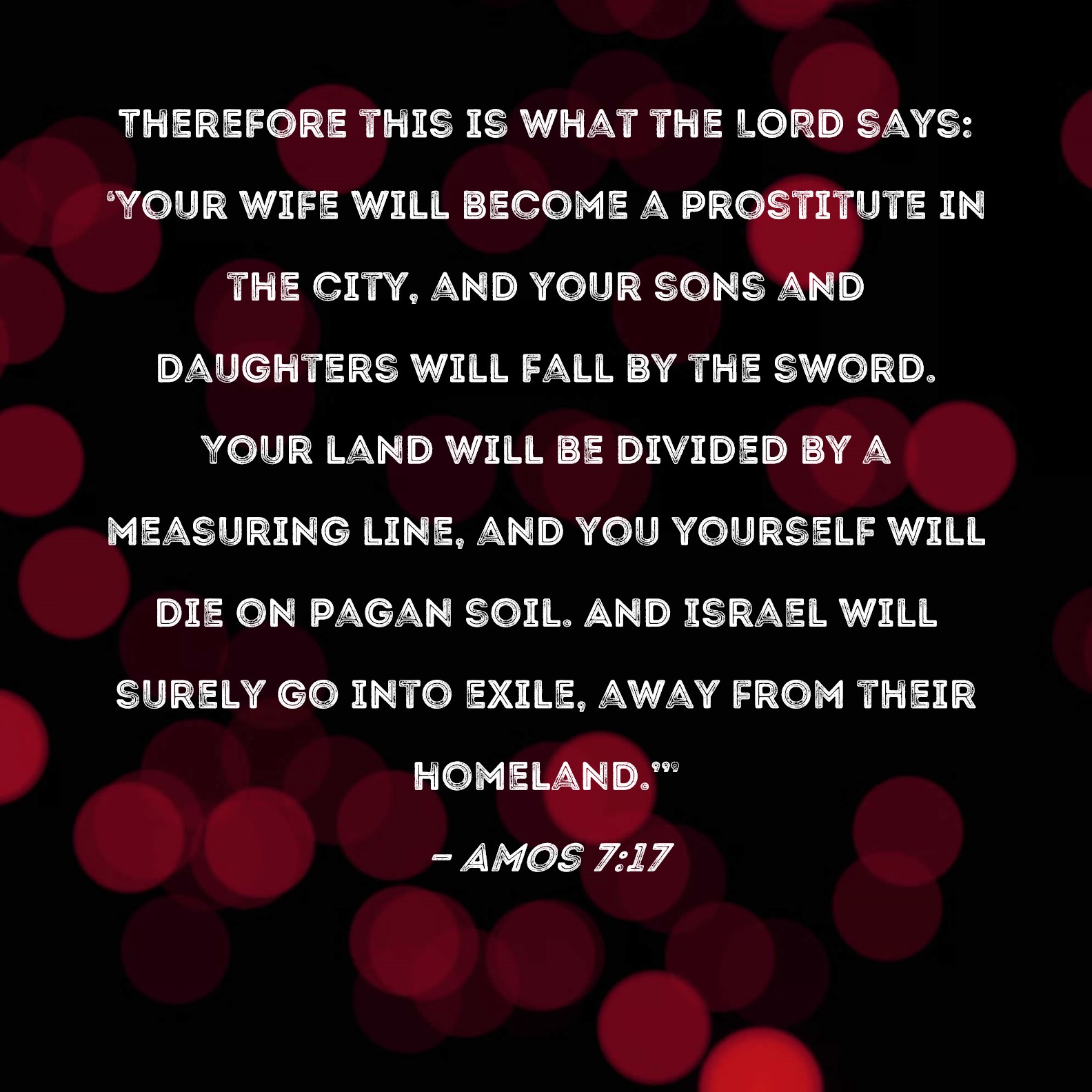 Amos 7:17 Therefore this is what the LORD says: 'Your wife will become a prostitute in the city, and your sons and daughters will fall by the sword. Your land will be divided by a measuring line, and you yourself will die on pagan soil. And Israel will surely go into exile, away from their homeland.'"
