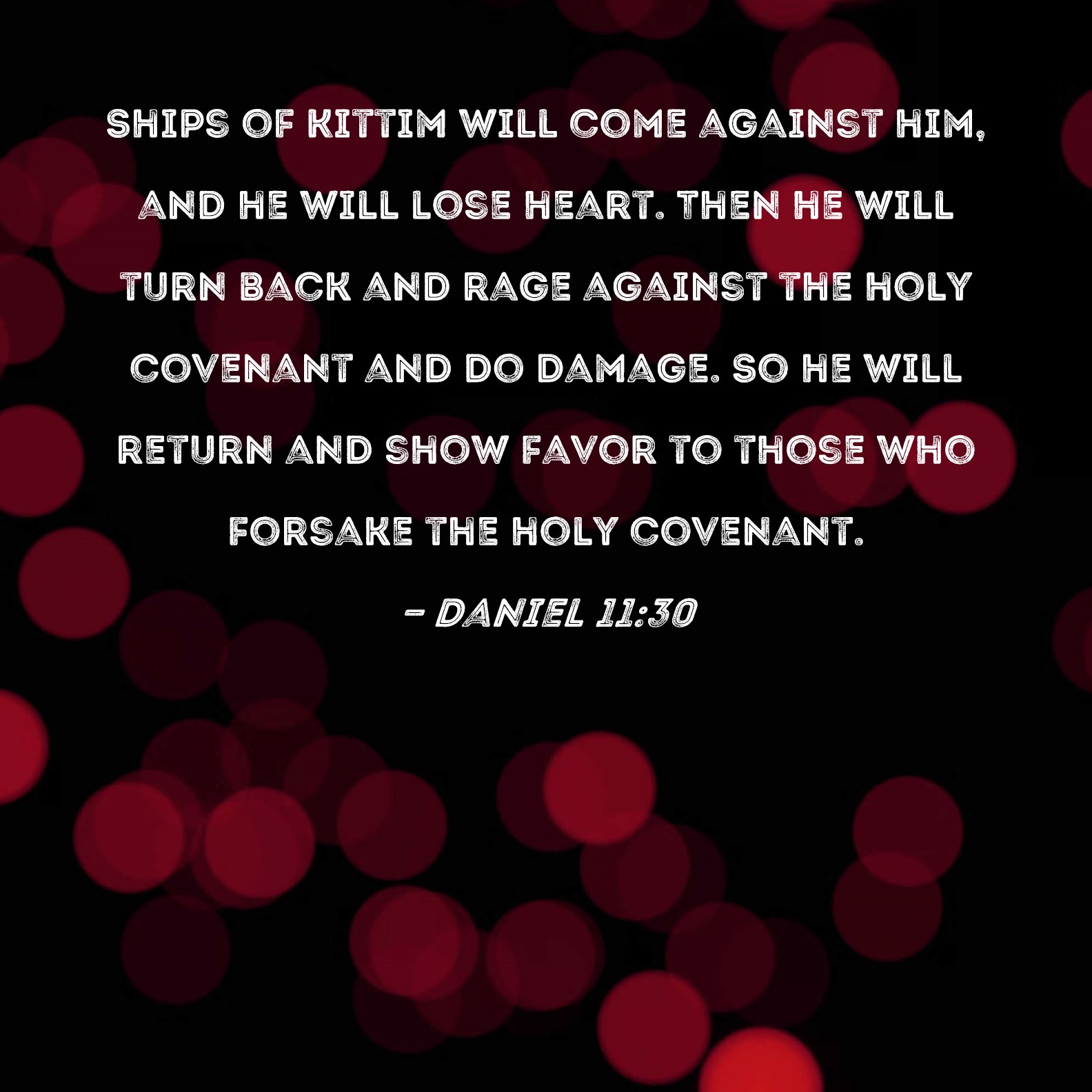Daniel 11:30 Ships of Kittim will come against him, and he will lose heart. Then he will turn back and rage against the holy covenant and do damage. So he will return and show favor to those who forsake the holy covenant.