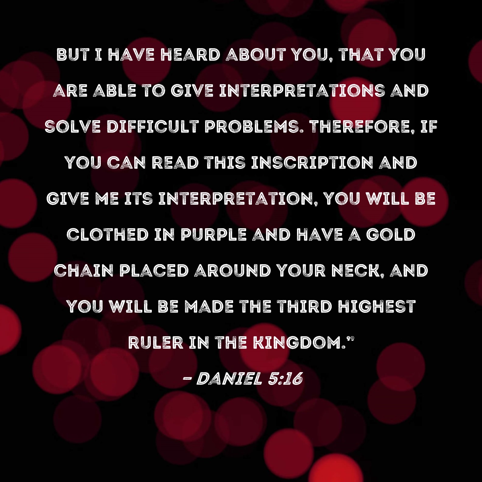 Daniel 5:16 But I have heard about you, that you are able to give interpretations and solve difficult problems. Therefore, if you can read this inscription and give me its interpretation, you will be clothed in purple and have a gold chain placed around your neck, and you will be made the third highest ruler in the kingdom."