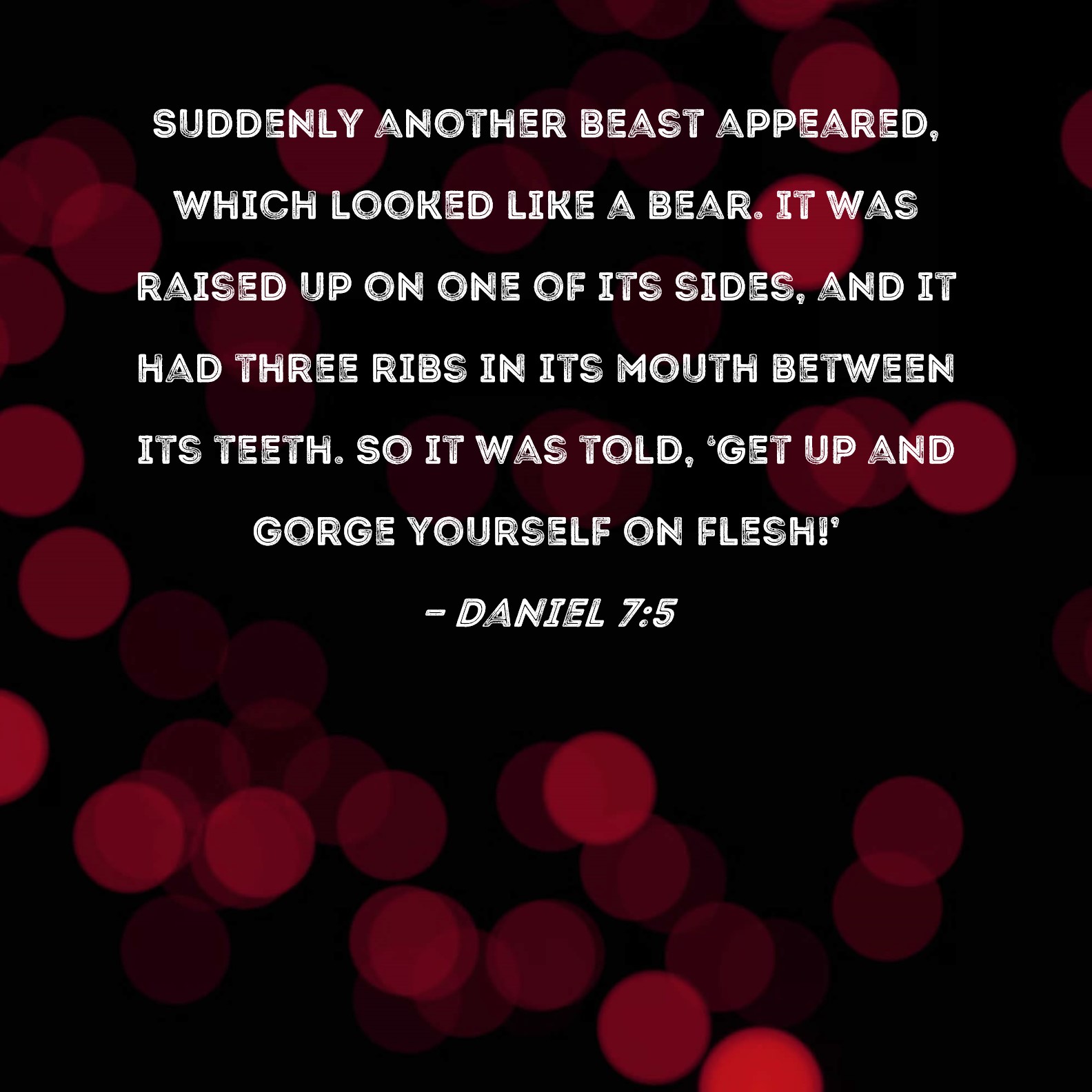 Daniel 7:5 Suddenly another beast appeared, which looked like a bear. It was raised up on one of its sides, and it had three ribs in its mouth between its teeth. So it was told, 'Get up and gorge yourself on flesh!'