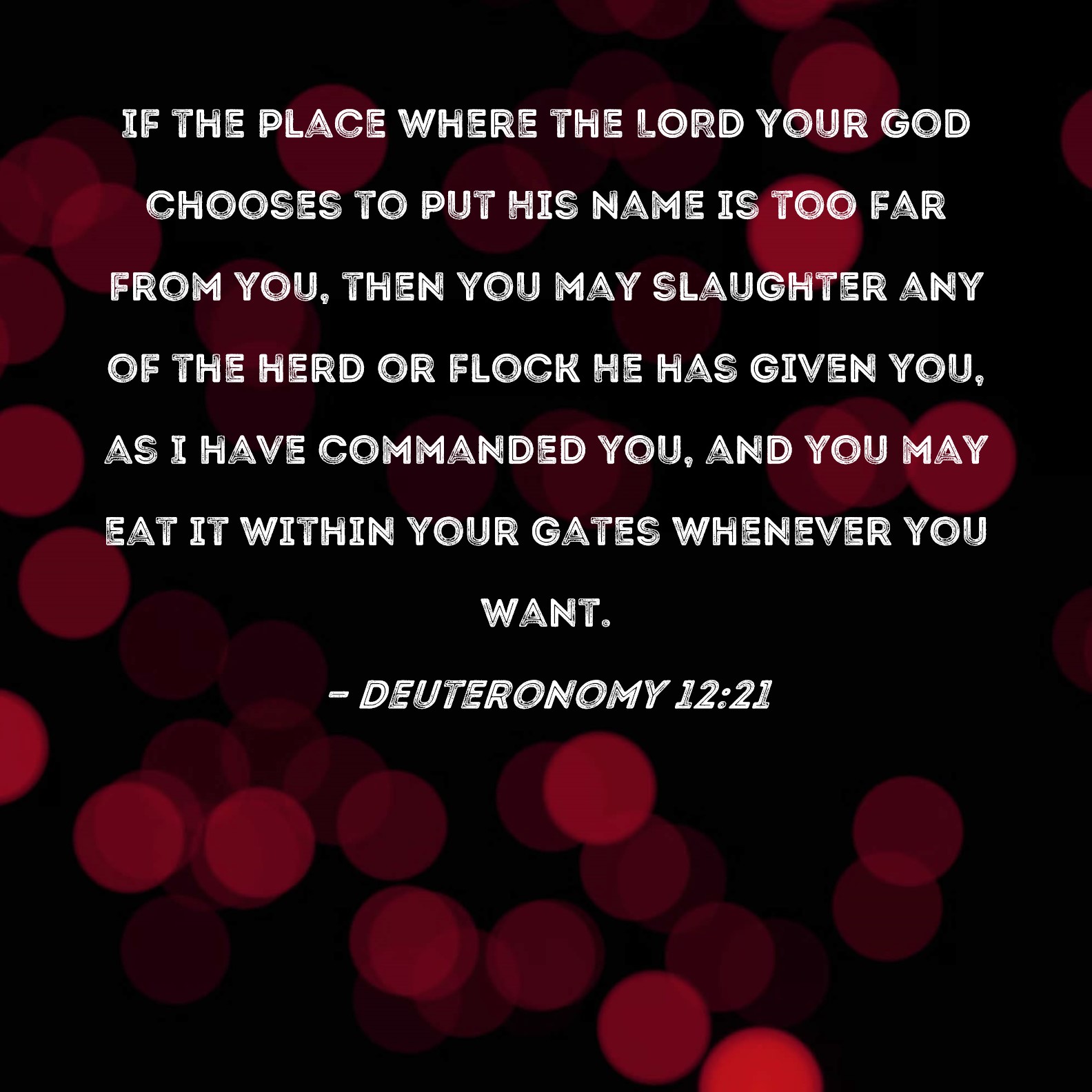 Deuteronomy 12:21 If the place where the LORD your God chooses to put His Name is too far from you, then you may slaughter any of the herd or flock He has given you, as I have commanded you, and you may eat it within your gates whenever you want.