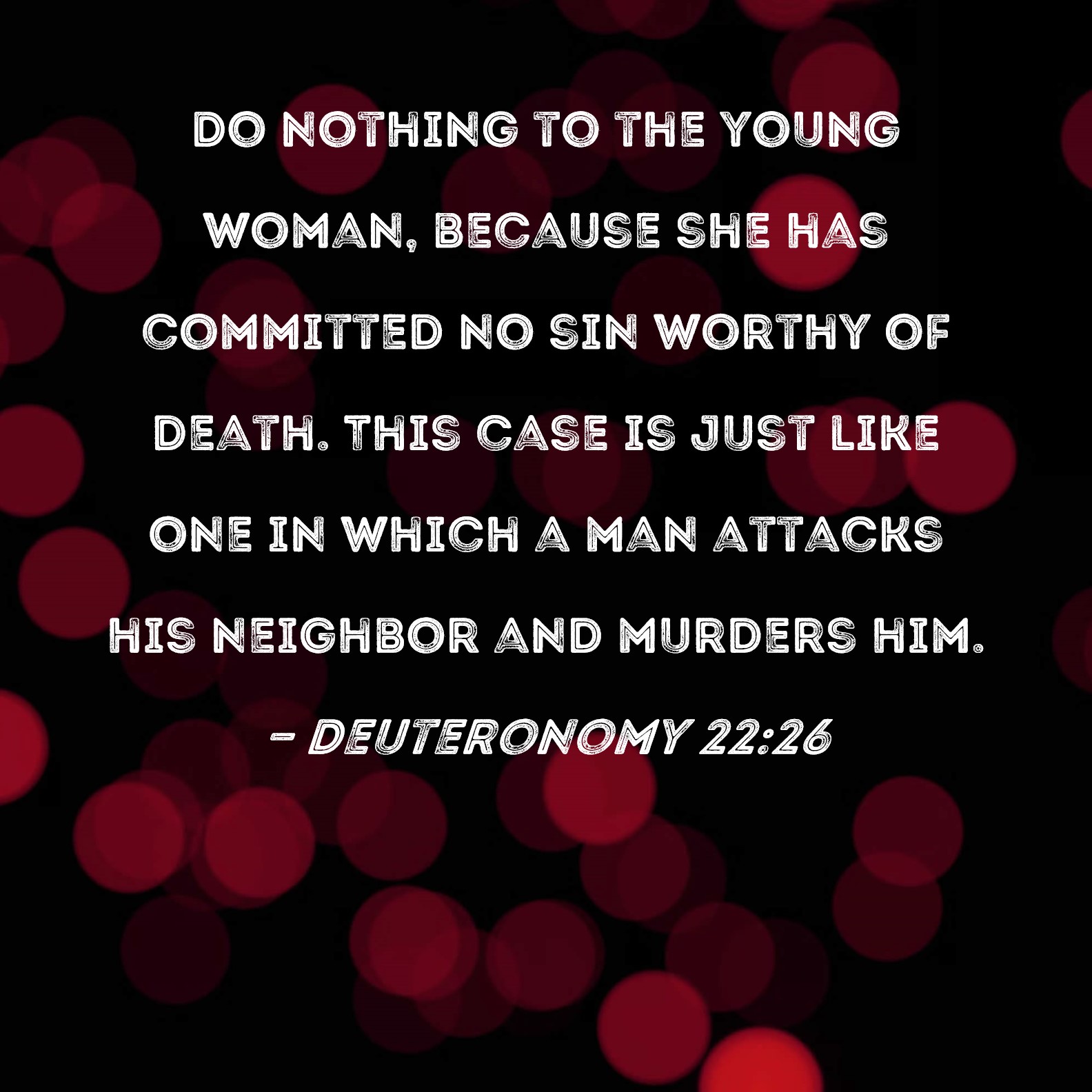 Deuteronomy 22:26 Do nothing to the young woman, because she has committed no sin worthy of death. This case is just like one in which a man attacks his neighbor and murders him.