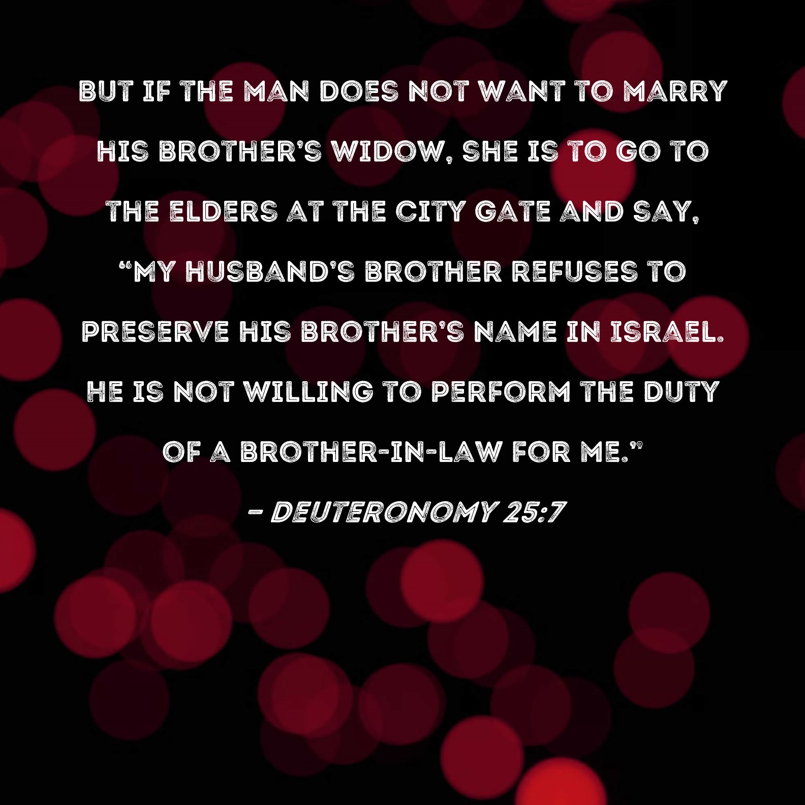 Deuteronomy 25:7 But if the man does not want to marry his brother's widow, she is to go to the elders at the city gate and say, "My husband's brother refuses to preserve his brother's name in Israel. He is not willing to perform the duty of a brother-in-law for me."