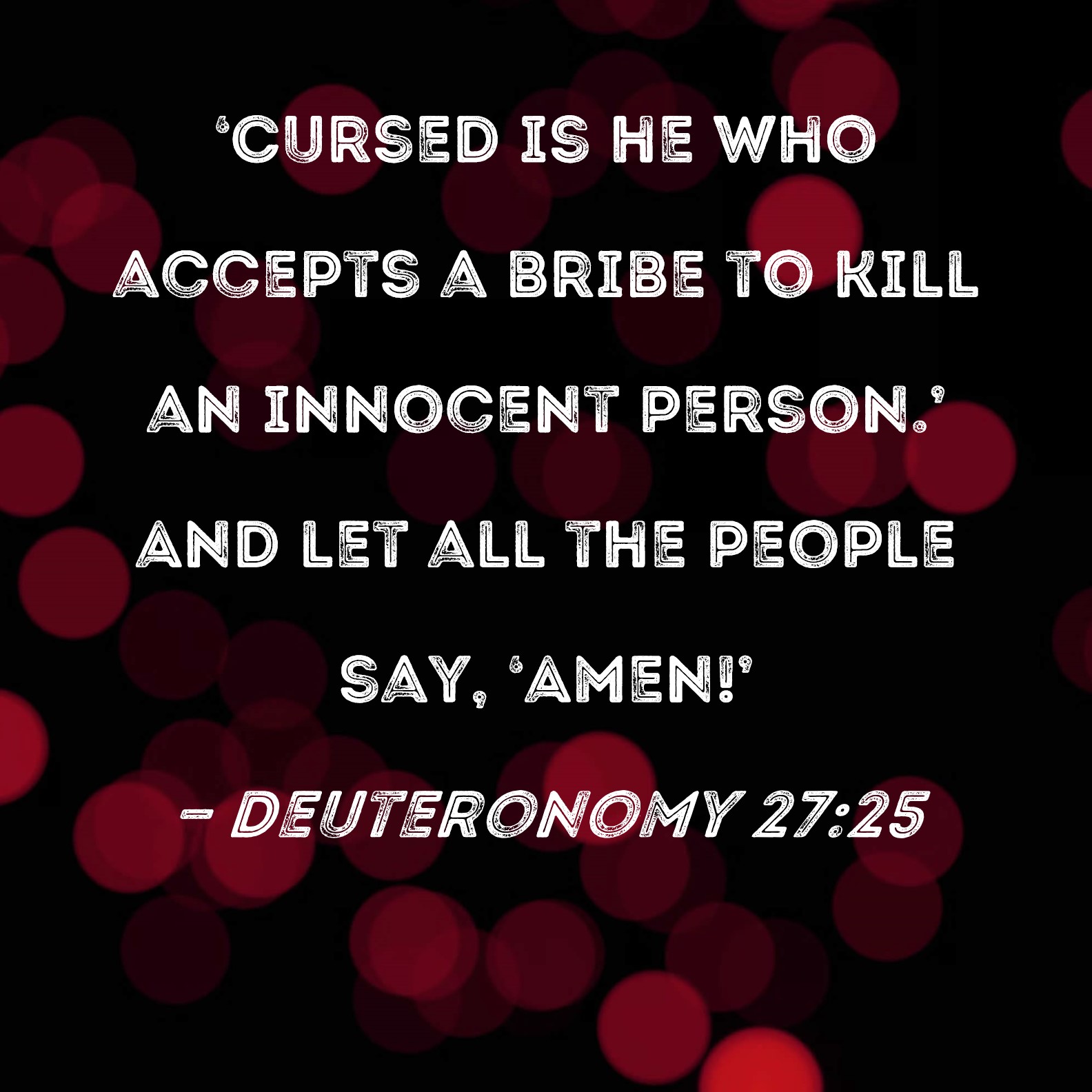 Deuteronomy 27:25 Cursed is he who accepts a bribe to kill an innocent person.' And let all the people say, 'Amen!'
