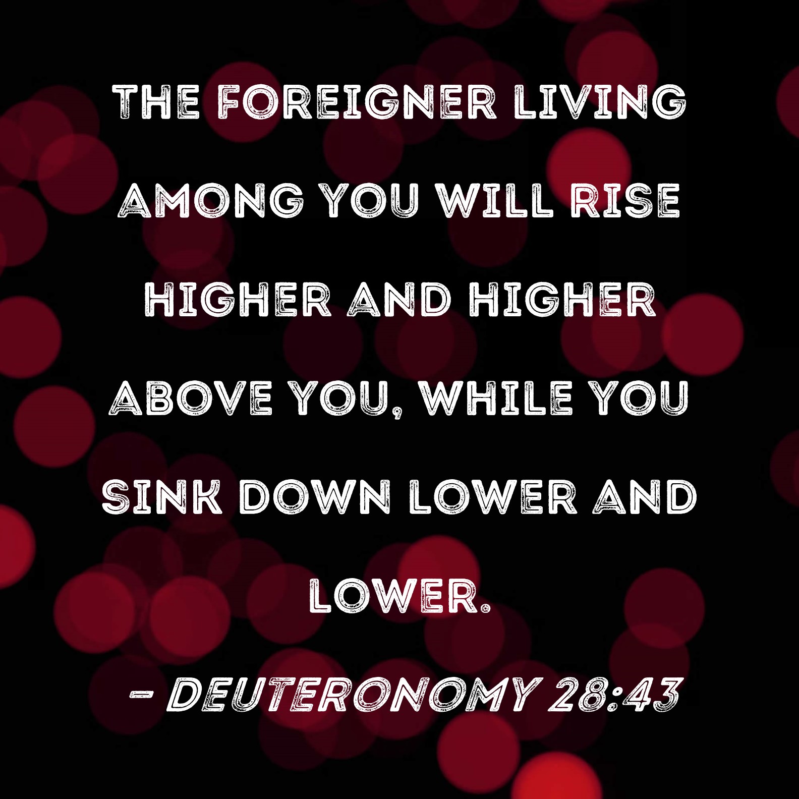 Deuteronomy 28:43 The foreigner living among you will rise higher and higher above you, while you sink down lower and lower.