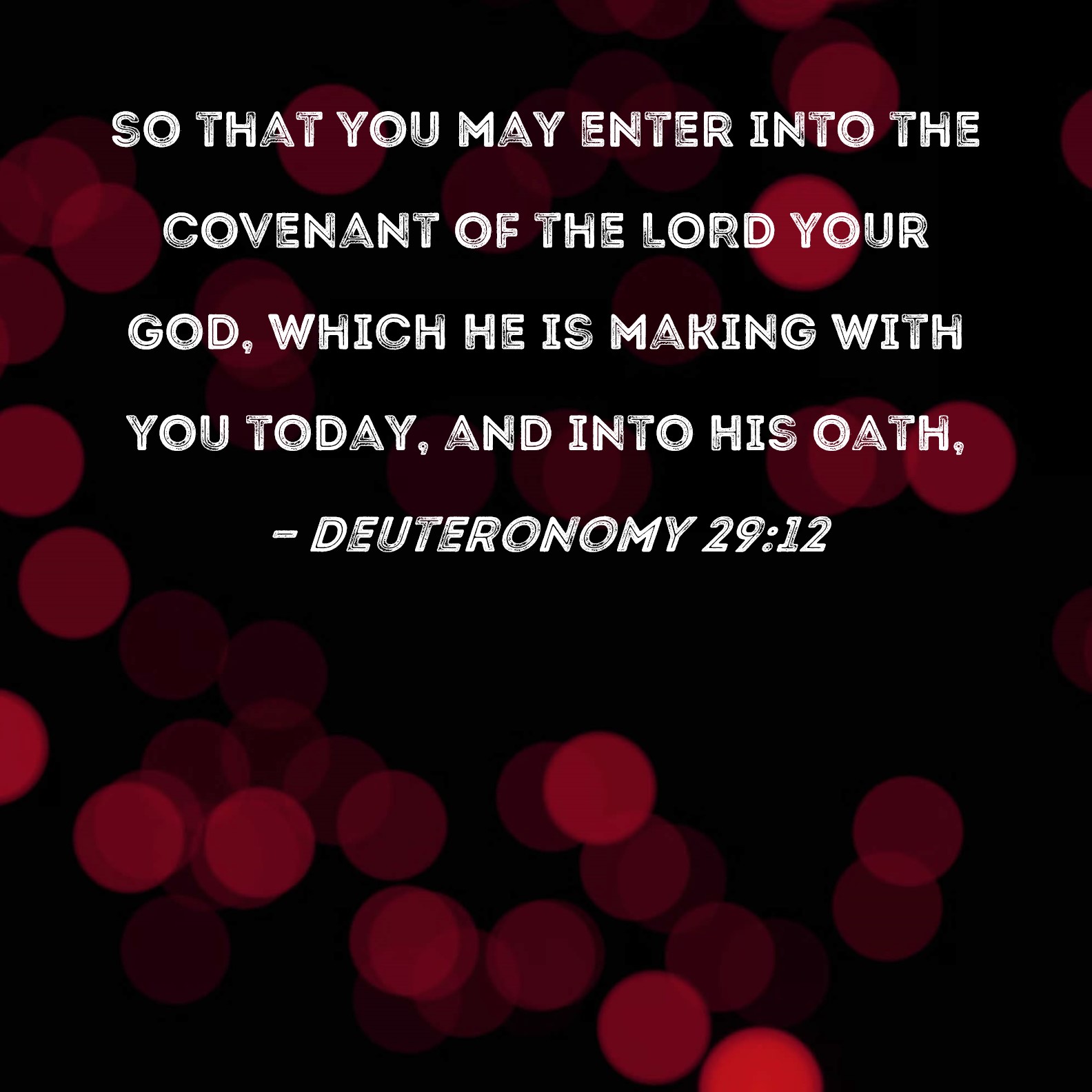 BSB: so that you may enter into the covenant of the LORD your God, which He is making with you today, and into His oath, KJV: That thou shouldest enter into covenant with the LORD thy God, and into his oath, which the LORD thy God maketh with thee this day: DRB: That thou mayst pass in the covenant of the Lord thy God, and in the oath which this day the Lord thy God maketh with thee. DBT: that thou mayest enter into the covenant of Jehovah thy God, and into his oath, which Jehovah thy God maketh with thee this day; ERV: that thou shouldest enter into the covenant of the LORD thy God, and into his oath, which the LORD thy God maketh with thee this day: WBT: That thou shouldst enter into covenant with the LORD thy God, and into his oath, which the LORD thy God maketh with thee this day: WEB: that you may enter into the covenant of Yahweh your God, and into his oath, which Yahweh your God makes with you today, YLT: for thy passing over into the covenant of Jehovah thy God, and into His oath which Jehovah thy God is making with thee to-day;Links Deuteronomy 29:12 NIV • Deuteronomy 29:12 NLT • Deuteronomy 29:12 ESV • Deuteronomy 29:12 NASB • Deuteronomy 29:12 KJV • Deuteronomy 29:12 Interlinear • Deuteronomy 29:12 Commentaries • Deuteronomy 29:12 Parallel Texts • Deuteronomy 29:12 Bible Apps • Deuteronomy 29:12 Parallel • Bible Hub |