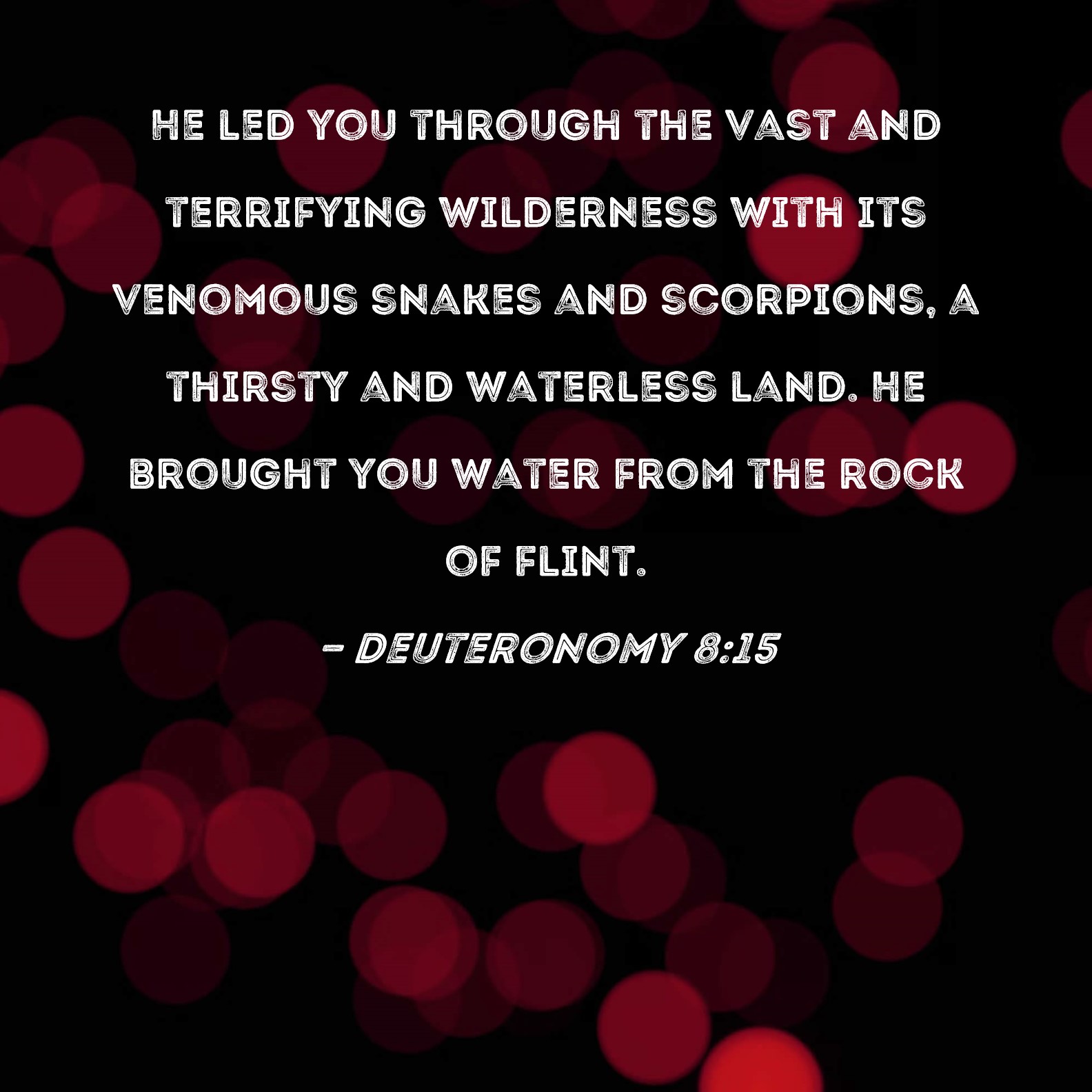 Deuteronomy 8:15 He led you through the vast and terrifying wilderness with its venomous snakes and scorpions, a thirsty and waterless land. He brought you water from the rock of flint.