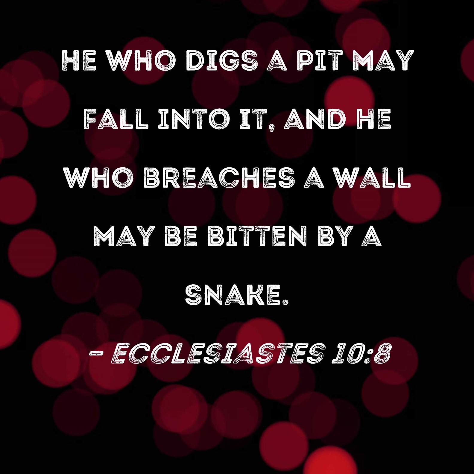 Ecclesiastes 10:8 He who digs a pit may fall into it, and he who breaches a wall may be bitten by a snake.