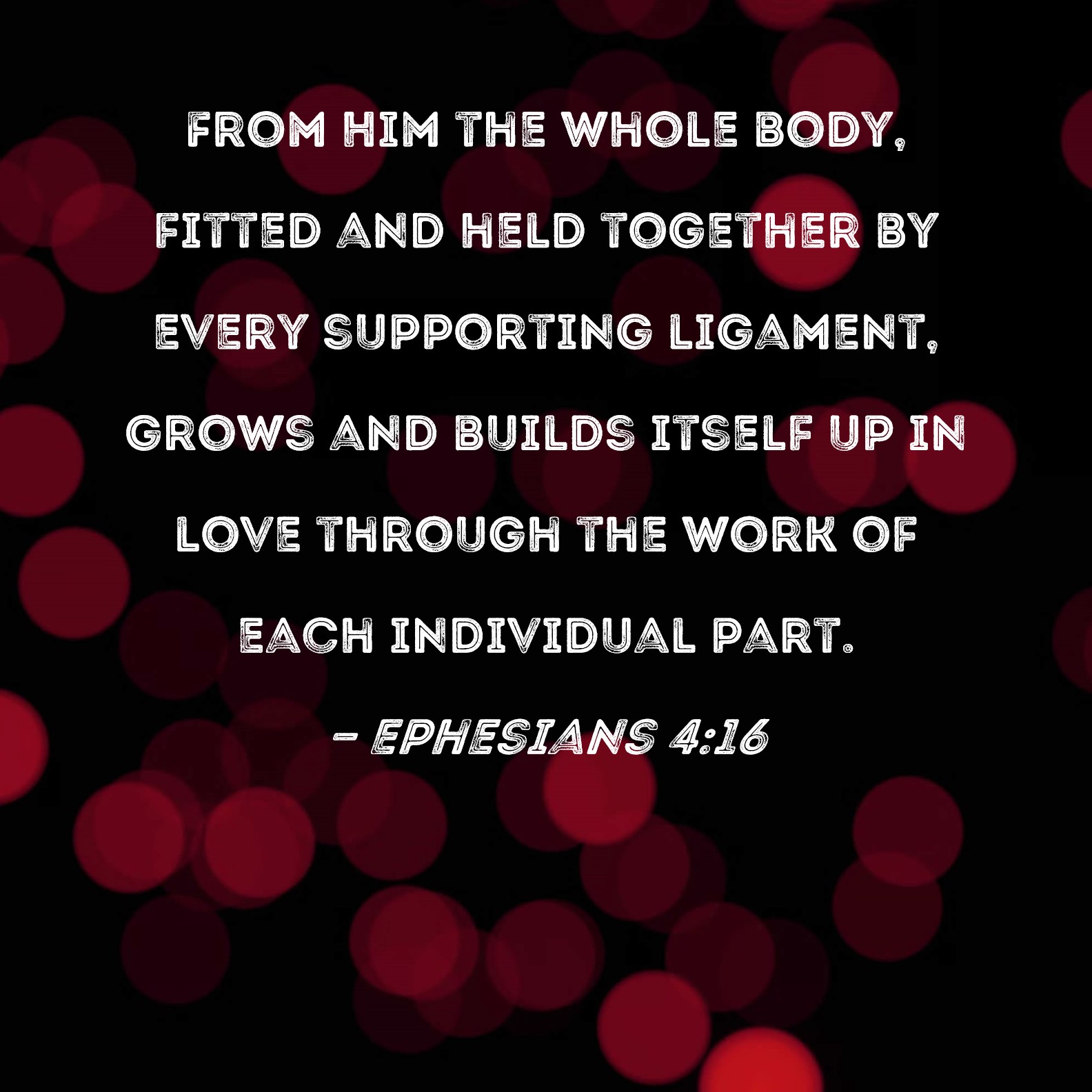 Ephesians 4:16 From Him the whole body, fitted and held together by every supporting ligament, grows and builds itself up in love through the work of each individual part.