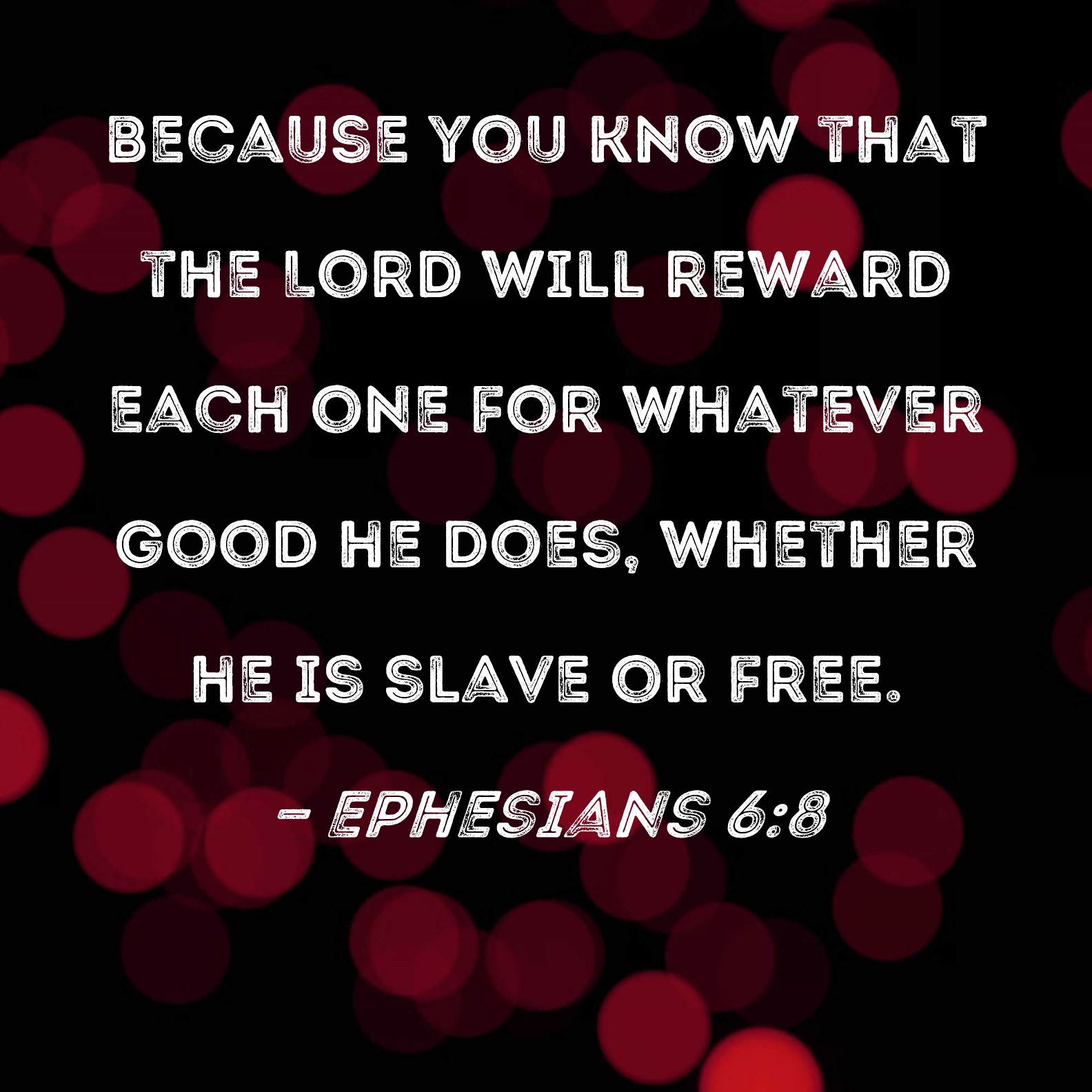 Ephesians 6:8 because you know that the Lord will reward each one for whatever good he does, whether he is slave or free.