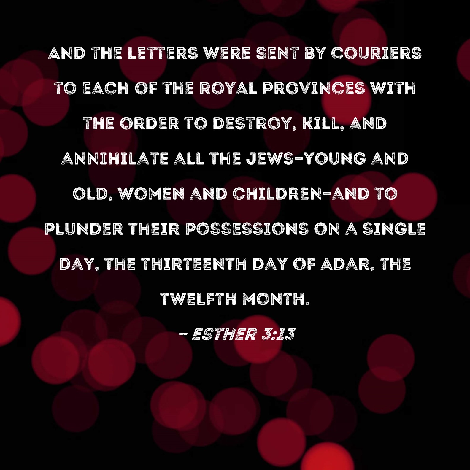 Esther 3:13 And the letters were sent by couriers to each of the royal provinces with the order to destroy, kill, and annihilate all the Jews--young and old, women and children--and to plunder their possessions on a single day, the thirteenth day of Adar, the twelfth month.