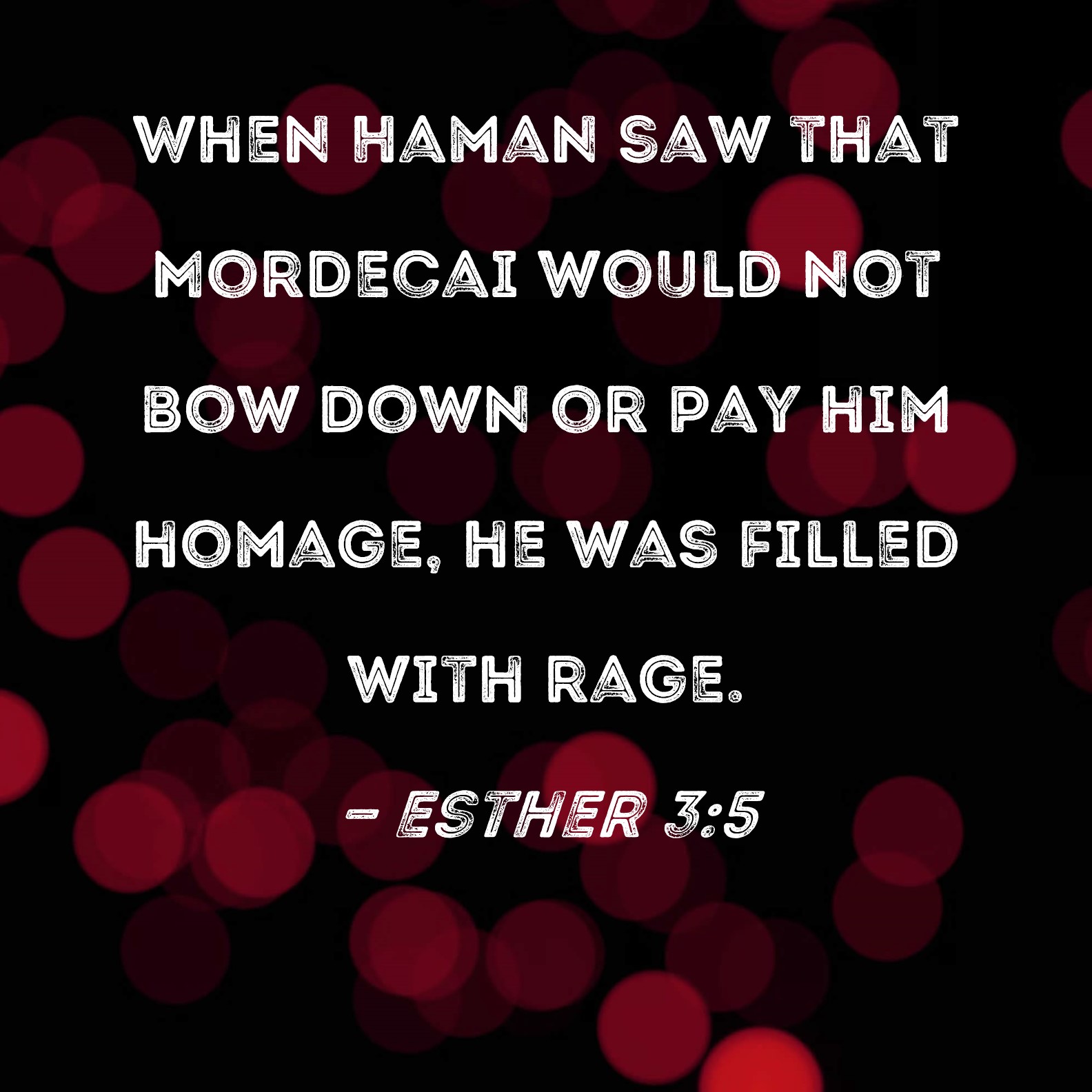 Esther 3:5 When Haman saw that Mordecai would not bow down or pay him homage, he was filled with rage.