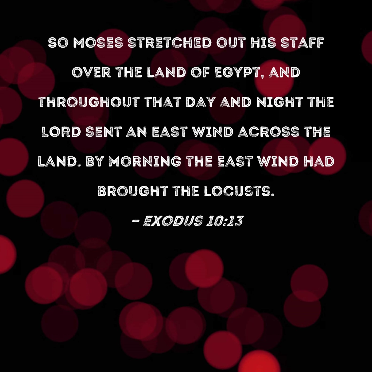 Exodus 10:13 So Moses stretched out his staff over the land of Egypt, and throughout that day and night the LORD sent an east wind across the land. By morning the east wind had brought the locusts.