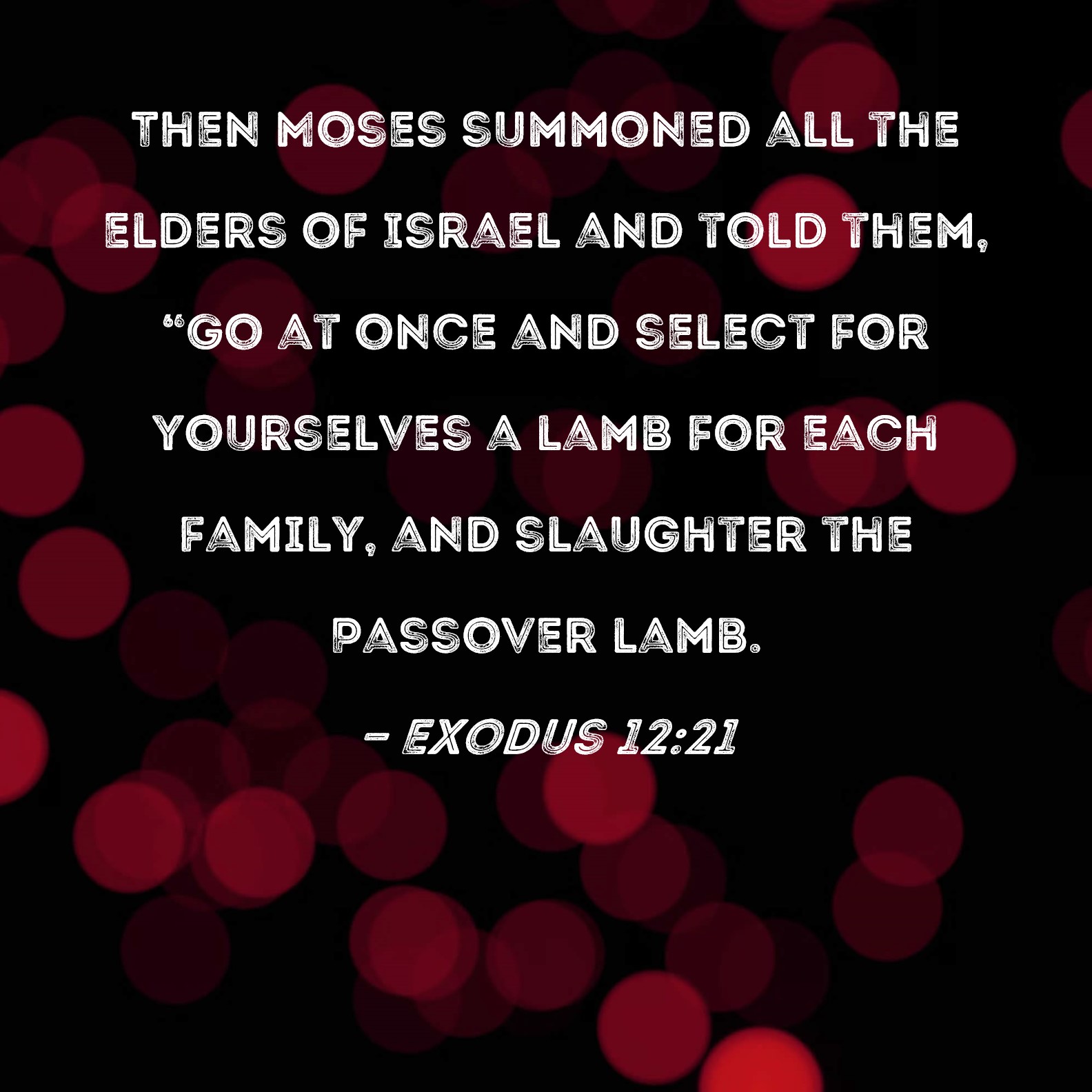 Exodus 12:21 Then Moses summoned all the elders of Israel and told them, "Go at once and select for yourselves a lamb for each family, and slaughter the Passover lamb.