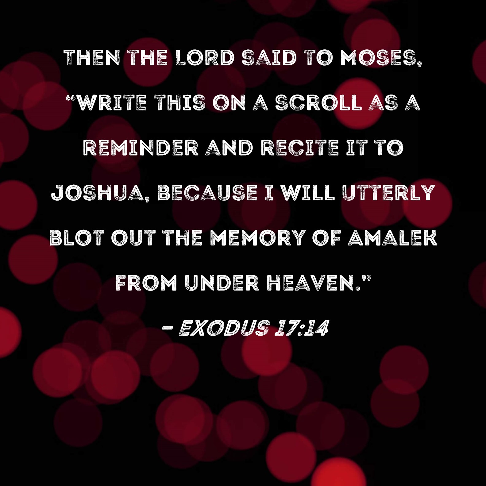Exodus 17:14 Then the LORD said to Moses, "Write this on a scroll as a reminder and recite it to Joshua, because I will utterly blot out the memory of Amalek from under heaven."