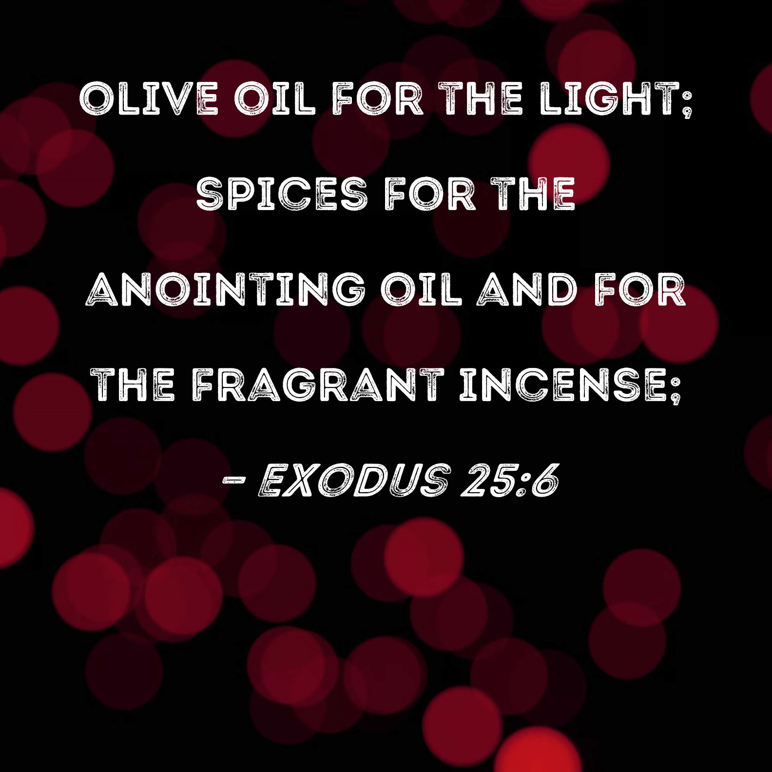 Exodus 25:6 olive oil for the light; spices for the anointing oil and for the fragrant incense;