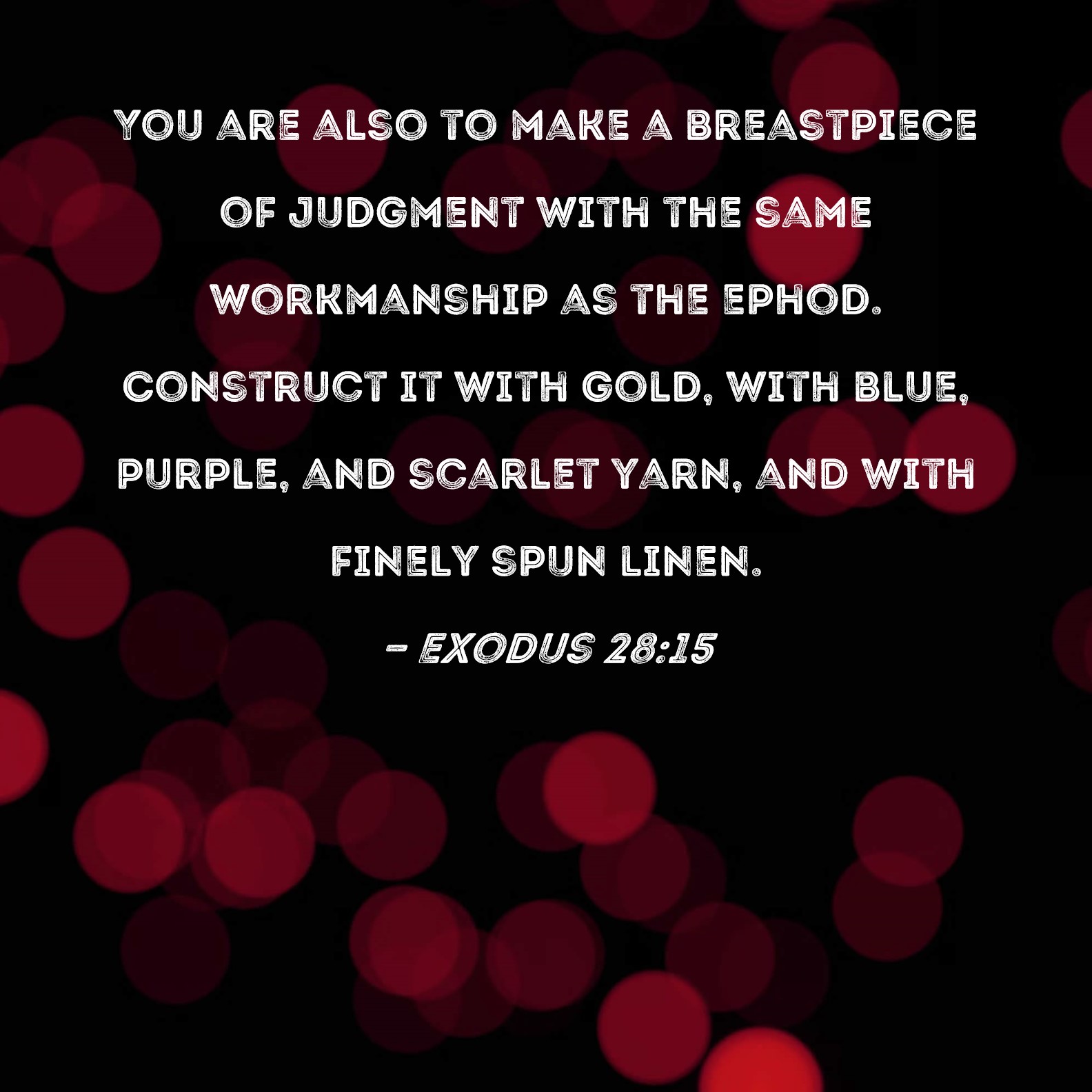 Exodus 28:15 You are also to make a breastpiece of judgment with the same workmanship as the ephod. Construct it with gold, with blue, purple, and scarlet yarn, and with finely spun linen.
