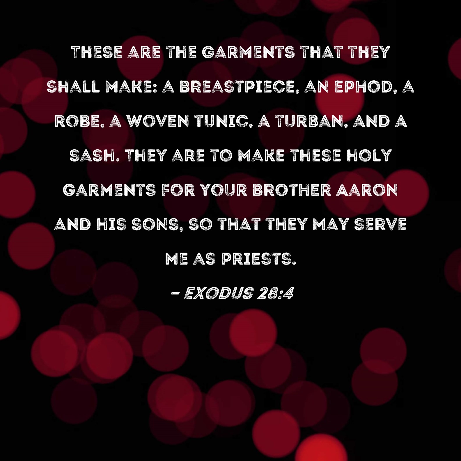 Exodus 28:4 These are the garments that they shall make: a breastpiece, an ephod, a robe, a woven tunic, a turban, and a sash. They are to make these holy garments for your brother Aaron and his sons, so that they may serve Me as priests.