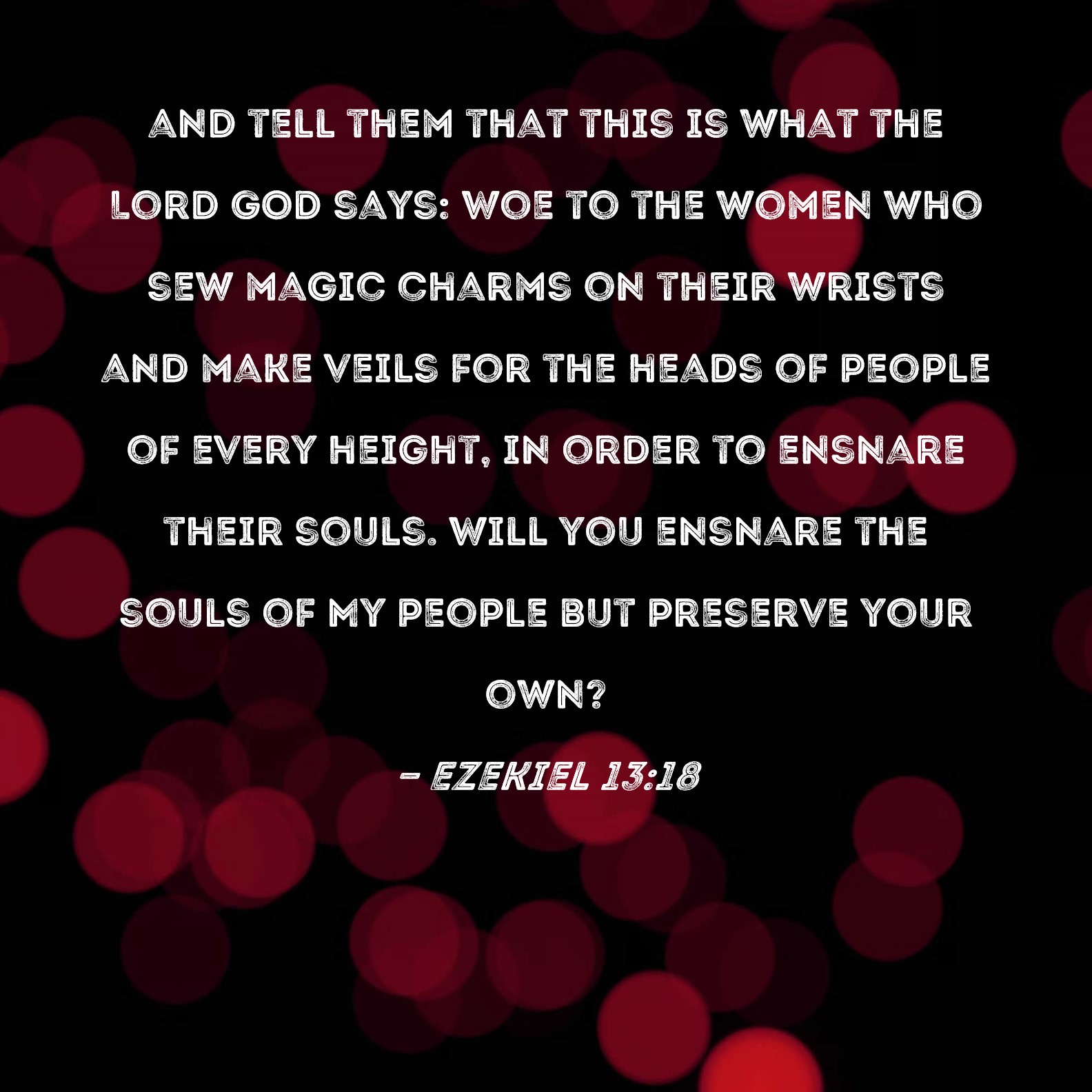 Ezekiel 13:18 and tell them that this is what the Lord GOD says: Woe to the women who sew magic charms on their wrists and make veils for the heads of people of every height, in order to ensnare their souls. Will you ensnare the souls of My people but preserve your own?