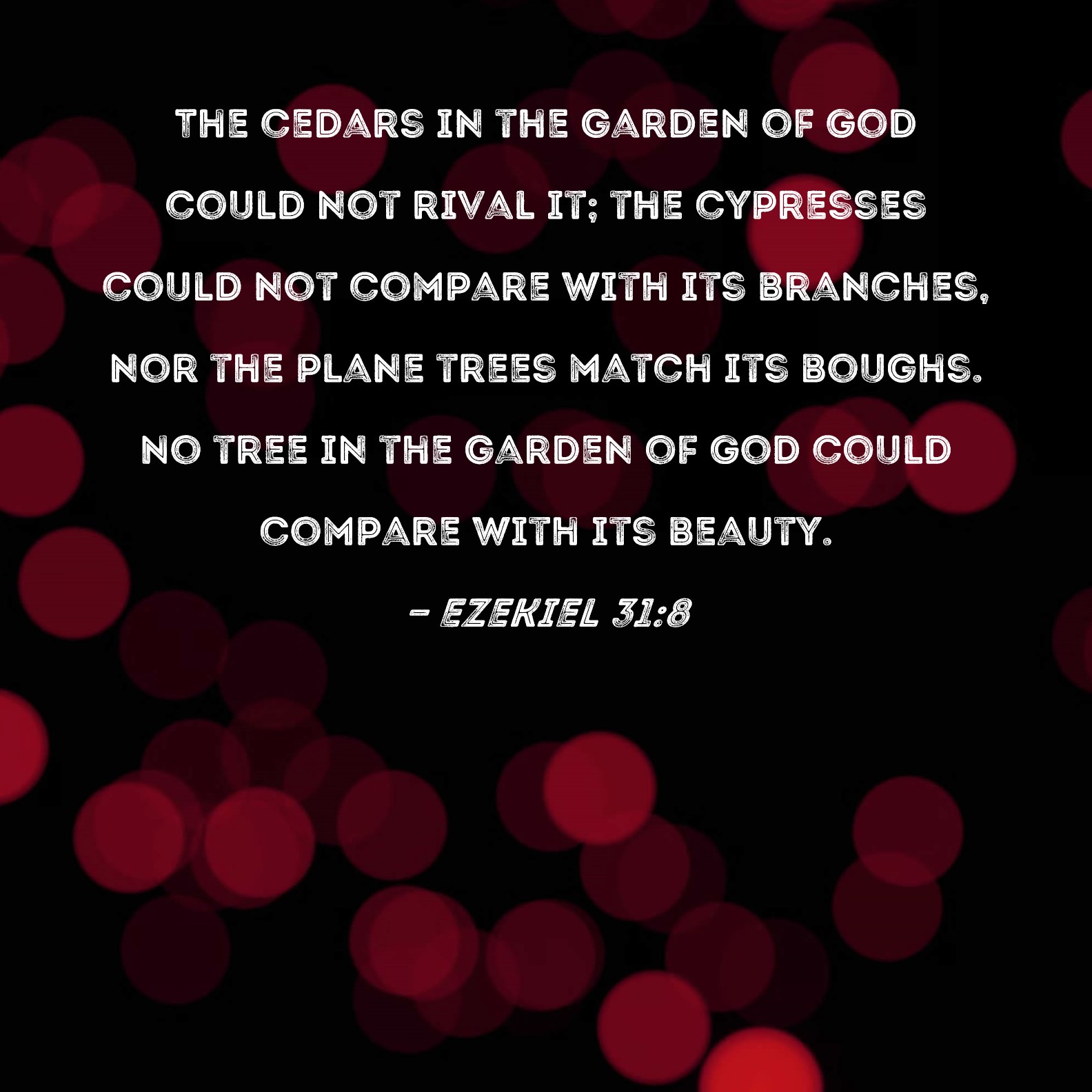 Ezekiel 31:8 The cedars in the garden of God could not rival it; the cypresses could not compare with its branches, nor the plane trees match its boughs. No tree in the garden of God could compare with its beauty.