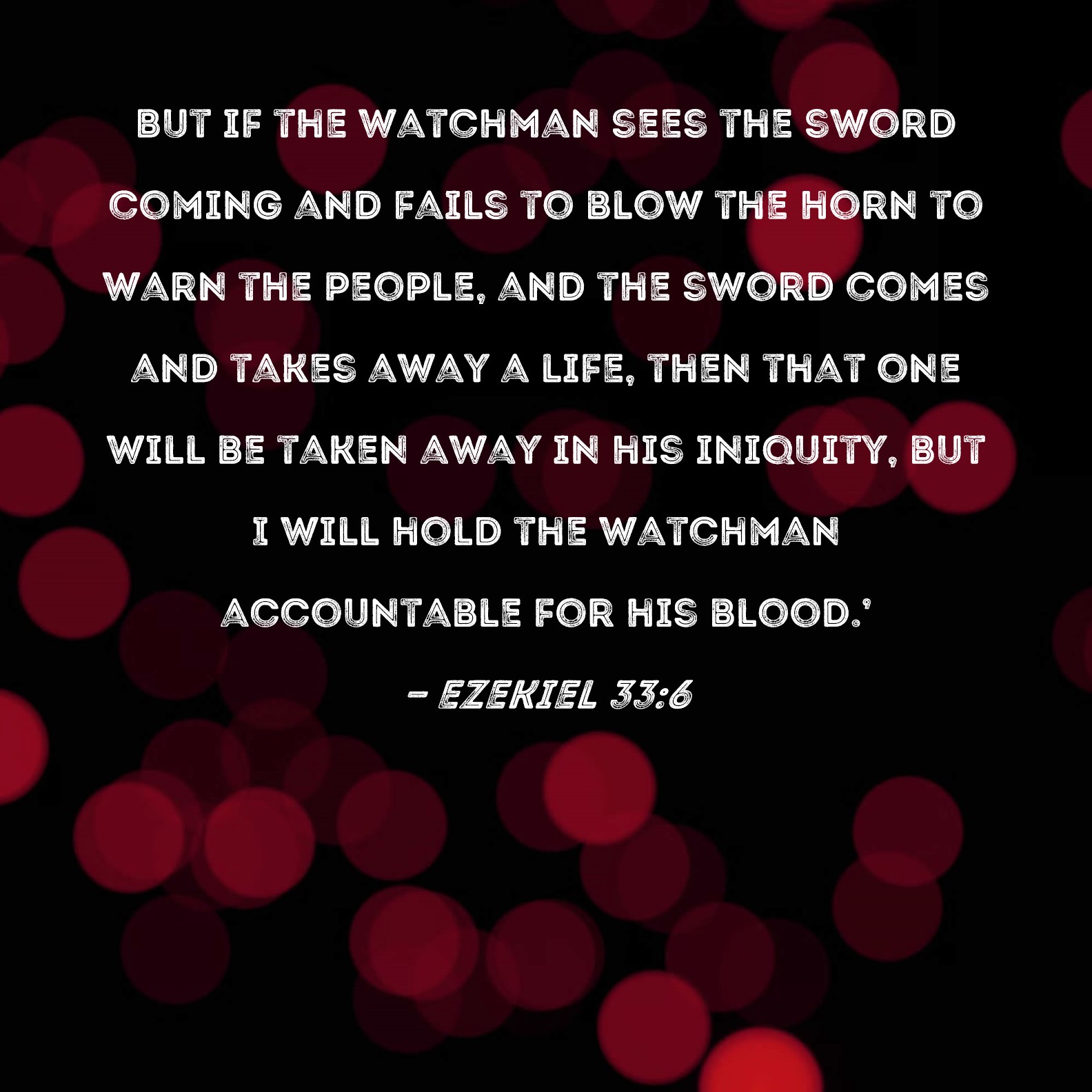KJV:  But if the watchman see the sword come, and blow not the trumpet, and the people be not warned; if the sword come, and take any person from among them, he is taken away in his iniquity; but his blood will I require at the watchman's hand.