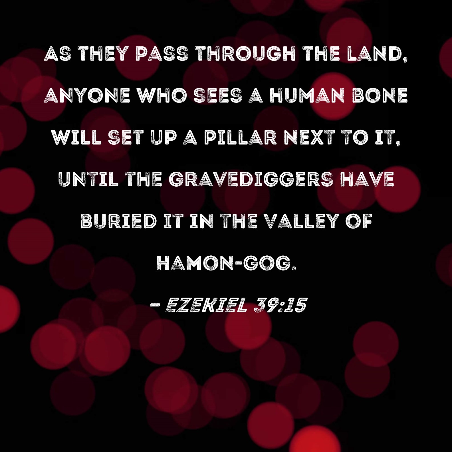 Ezekiel 39:15 As they pass through the land, anyone who sees a human bone will set up a pillar next to it, until the gravediggers have buried it in the Valley of Hamon-gog.