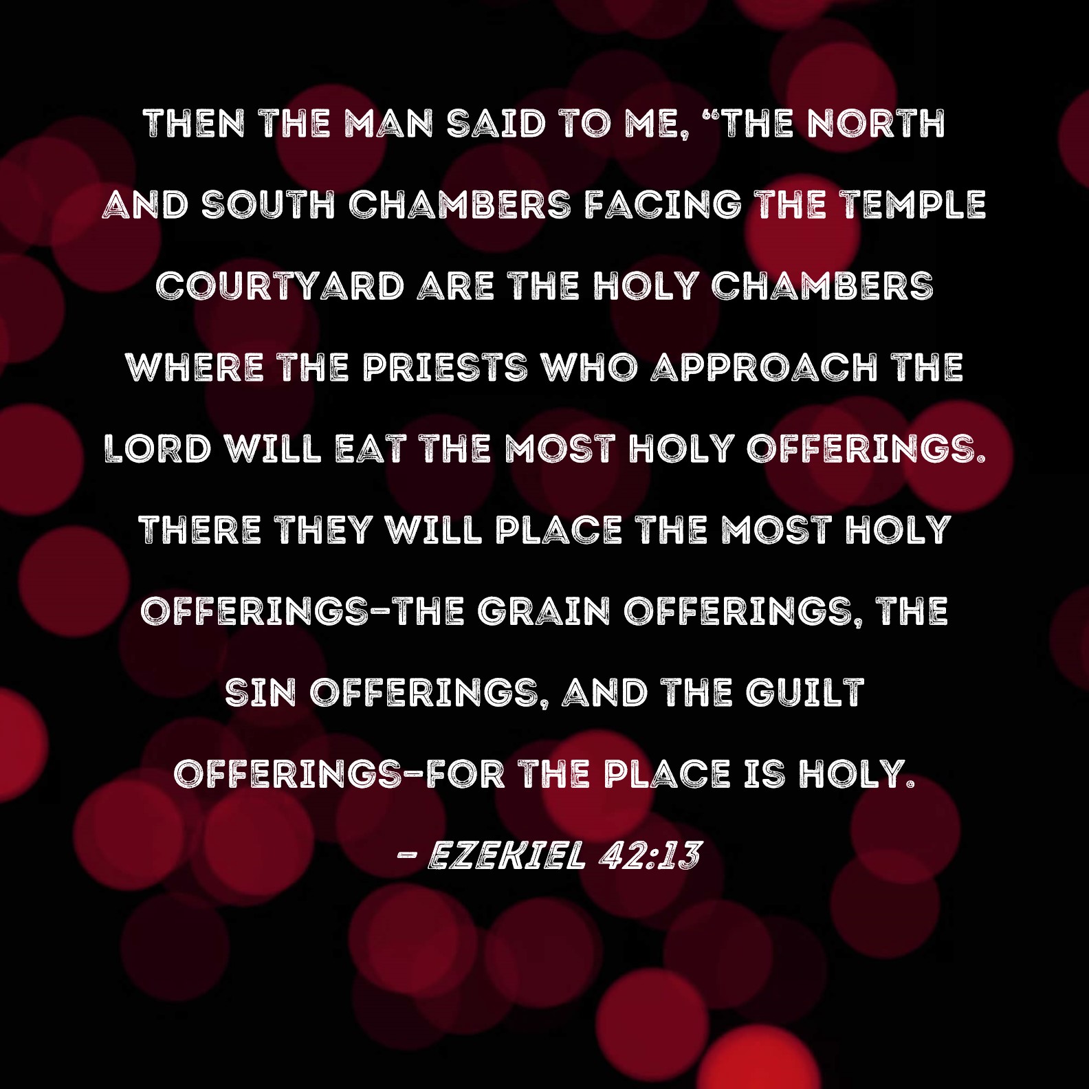 Ezekiel 42:13 Then the man said to me, "The north and south chambers facing the temple courtyard are the holy chambers where the priests who approach the LORD will eat the most holy offerings. There they will place the most holy offerings--the grain offerings, the sin offerings, and the guilt offerings--for the place is holy.