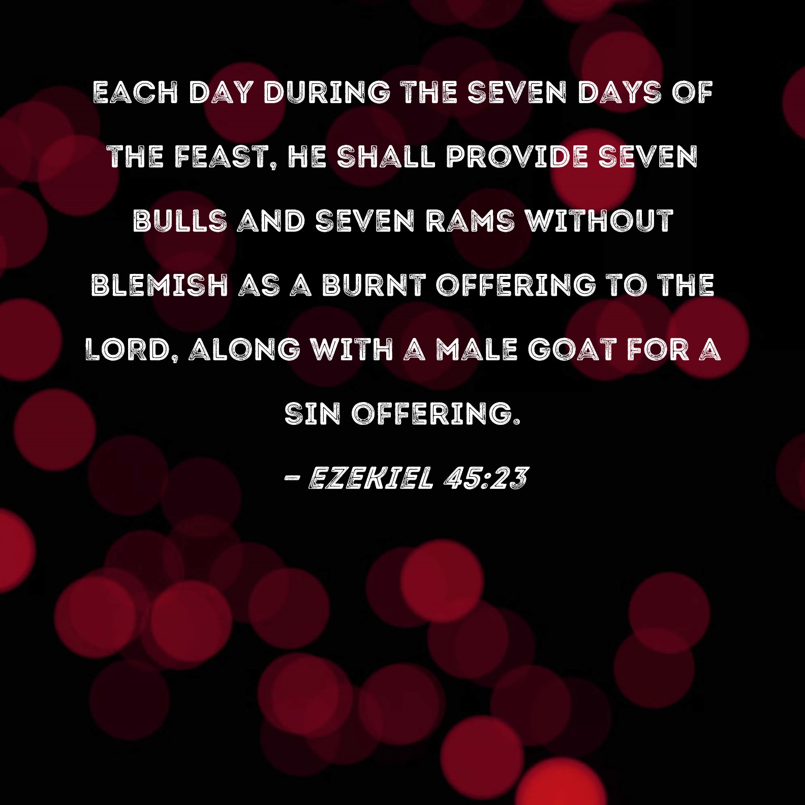 BSB: Each day during the seven days of the feast, he shall provide seven bulls and seven rams without blemish as a burnt offering to the LORD, along with a male goat for a sin offering. KJV: And seven days of the feast he shall prepare a burnt offering to the LORD, seven bullocks and seven rams without blemish daily the seven days; and a kid of the goats daily for a sin offering. DRB: And in the solemnity of the seven days he shall offer for a holocaust to the Lord, seven calves, and seven rams without blemish daily for seven days: and for sin a he goat daily. DBT: And the seven days of the feast he shall offer a burnt-offering to Jehovah, seven bullocks and seven rams without blemish daily for the seven days; and a he-goat daily for a sin-offering. ERV: And the seven days of the feast he shall prepare a burnt offering to the LORD, seven bullocks and seven rams without blemish daily the seven days; and a he-goat daily for a sin offering. WBT: And seven days of the feast he shall prepare a burnt-offering to the LORD, seven bullocks and seven rams without blemish daily the seven days; and a kid of the goats daily for a sin-offering. WEB: The seven days of the feast he shall prepare a burnt offering to Yahweh, seven bulls and seven rams without defect daily the seven days; and a male goat daily for a sin offering. YLT: And the seven days of the feast he prepareth a burnt-offering to Jehovah, seven bullocks, and seven rams, perfect ones, daily seven days, and a sin-offering, a kid of the goats, daily.Links Ezekiel 45:23 NIV • Ezekiel 45:23 NLT • Ezekiel 45:23 ESV • Ezekiel 45:23 NASB • Ezekiel 45:23 KJV • Ezekiel 45:23 Interlinear • Ezekiel 45:23 Commentaries • Ezekiel 45:23 Parallel Texts • Ezekiel 45:23 Bible Apps • Ezekiel 45:23 Parallel • Bible Hub |