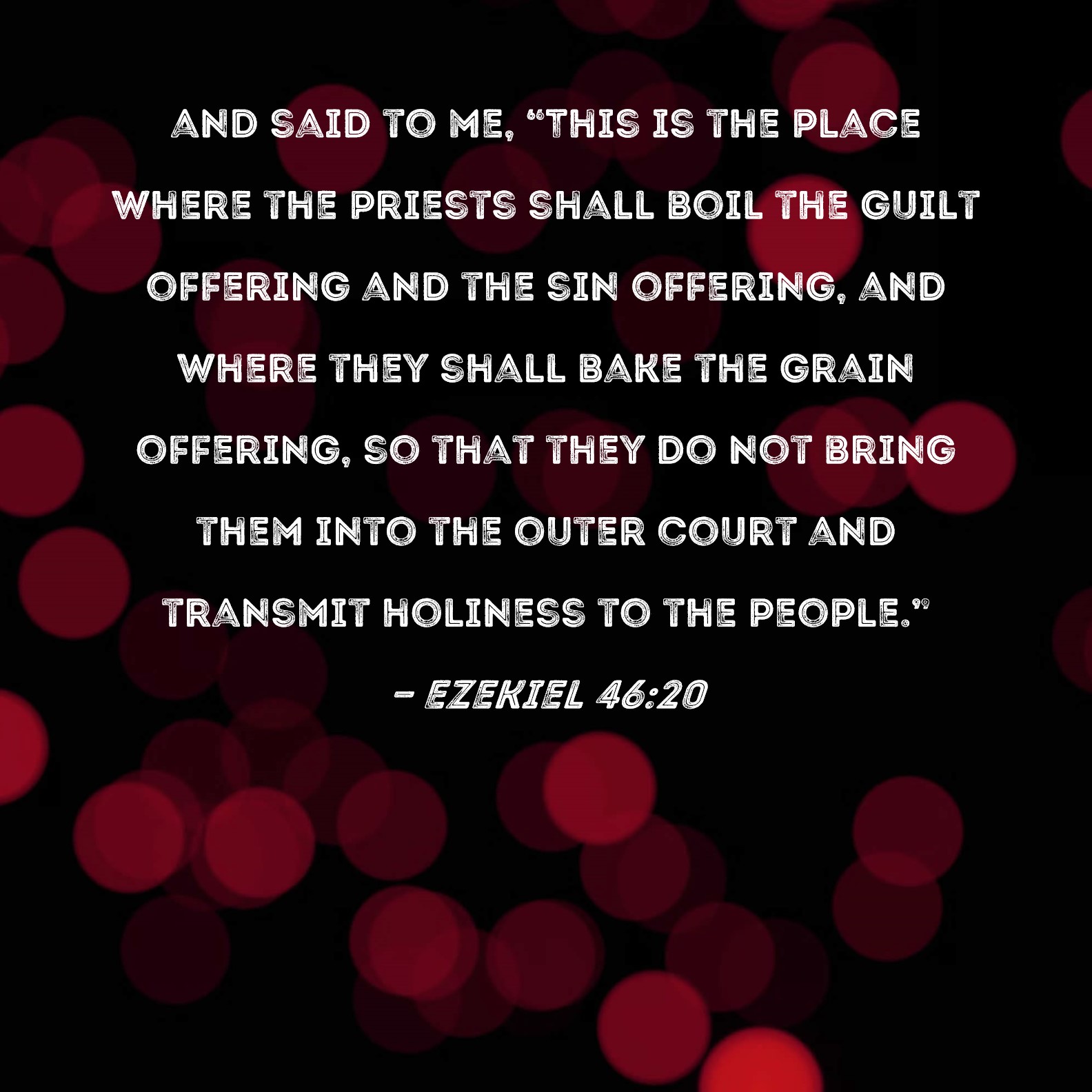 Ezekiel 46:20 and said to me, "This is the place where the priests shall boil the guilt offering and the sin offering, and where they shall bake the grain offering, so that they do not bring them into the outer court and transmit holiness to the people."