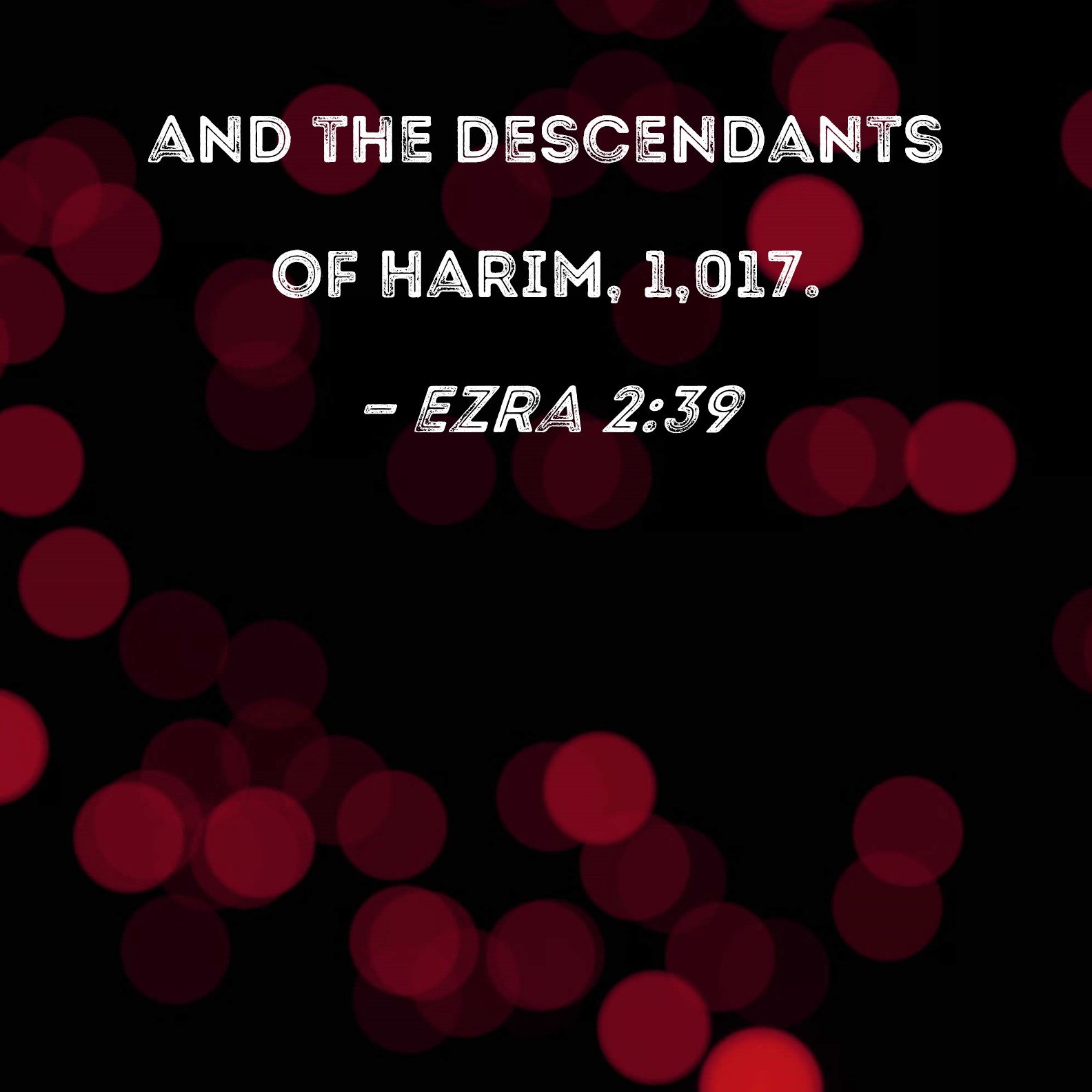 BSB: and the descendants of Harim, 1,017. KJV: The children of Harim, a thousand and seventeen. DRB: The children of Harim, a thousand and seventeen. DBT: The children of Harim, a thousand and seventeen. ERV: The children of Harim, a thousand and seventeen. WBT: The children of Harim, a thousand and seventeen. WEB: The children of Harim, one thousand seventeen. YLT: Sons of Harim, a thousand and seventeen.Links Ezra 2:39 NIV • Ezra 2:39 NLT • Ezra 2:39 ESV • Ezra 2:39 NASB • Ezra 2:39 KJV • Ezra 2:39 Interlinear • Ezra 2:39 Commentaries • Ezra 2:39 Parallel Texts • Ezra 2:39 Bible Apps • Ezra 2:39 Parallel • Bible Hub |