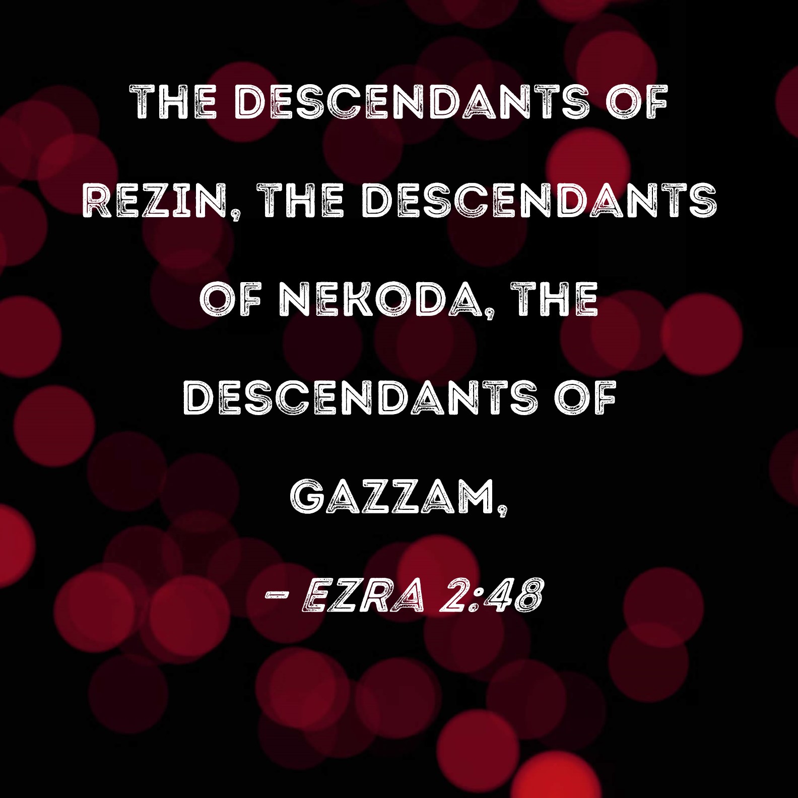Ezra 2:48 the descendants of Rezin, the descendants of Nekoda, the descendants of Gazzam,