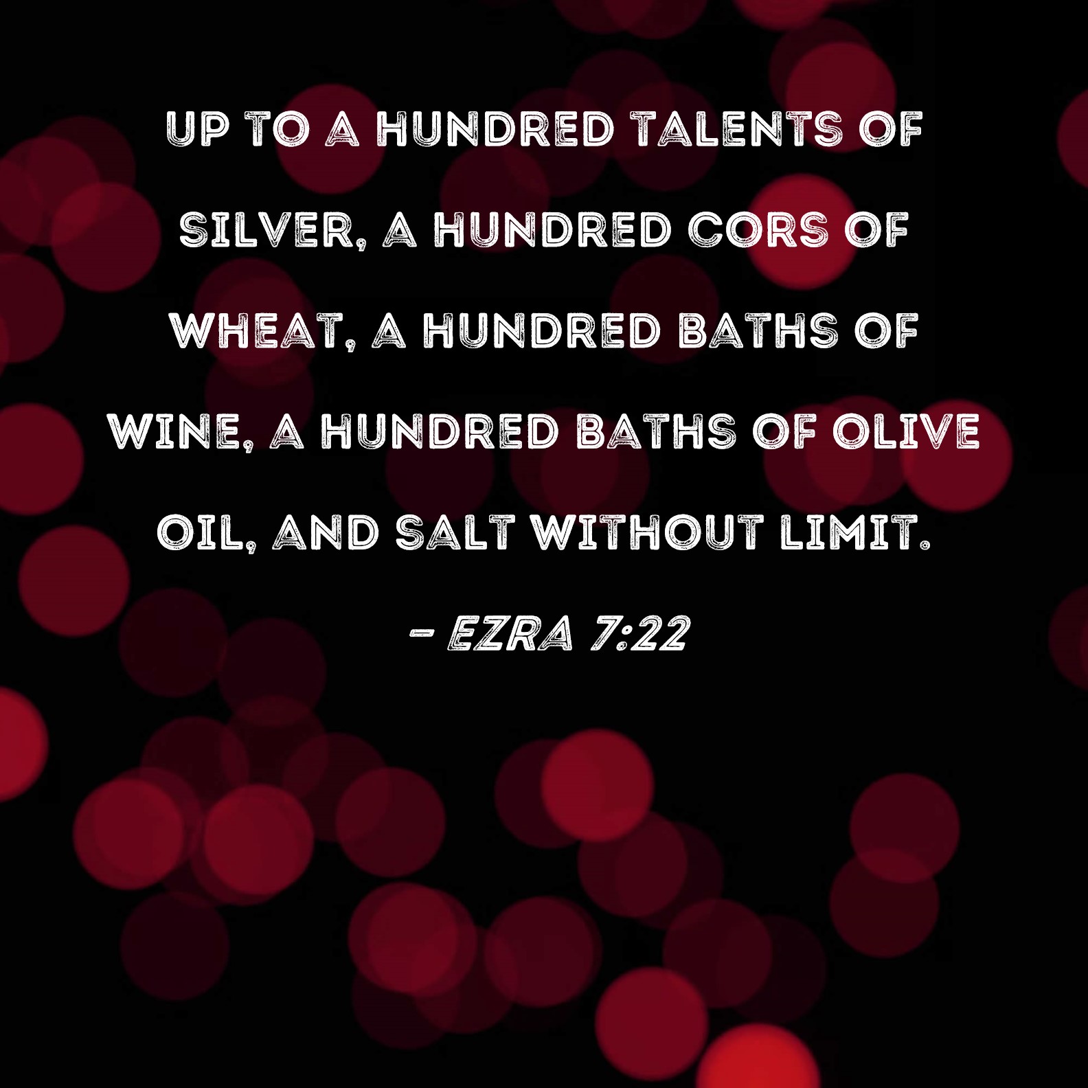 Ezra 7:22 up to a hundred talents of silver, a hundred cors of wheat, a hundred baths of wine, a hundred baths of olive oil, and salt without limit.