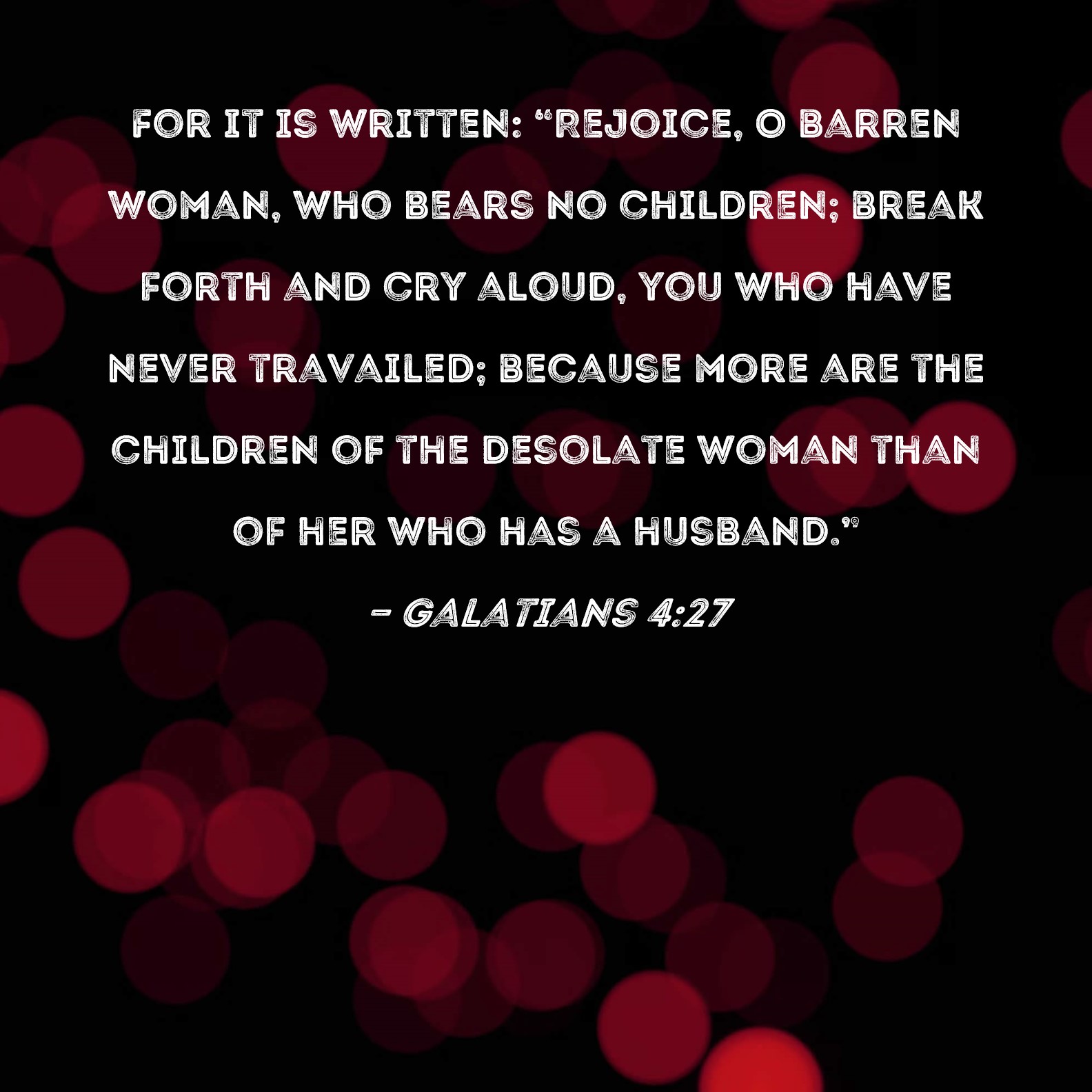 Galatians 4:27 For it is written: "Rejoice, O barren woman, who bears no children; break forth and cry aloud, you who have never travailed; because more are the children of the desolate woman than of her who has a husband."