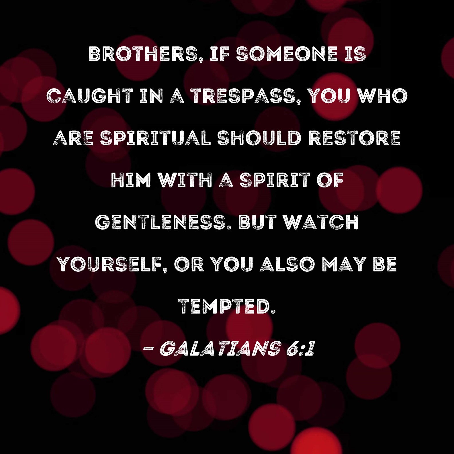 Galatians 6:1 Brothers, if someone is caught in a trespass, you who are spiritual should restore him with a spirit of gentleness. But watch yourself, or you also may be tempted.