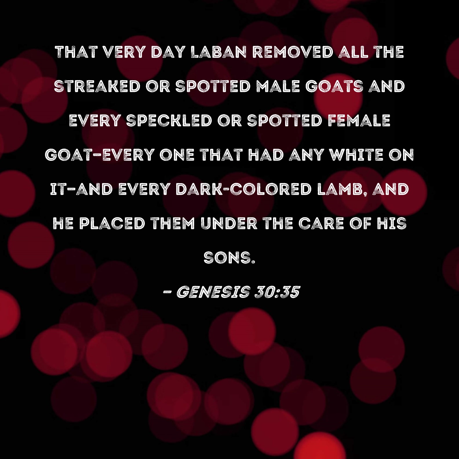 Genesis 30:35 That very day Laban removed all the streaked or spotted male goats and every speckled or spotted female goat--every one that had any white on it--and every dark-colored lamb, and he placed them under the care of his sons.