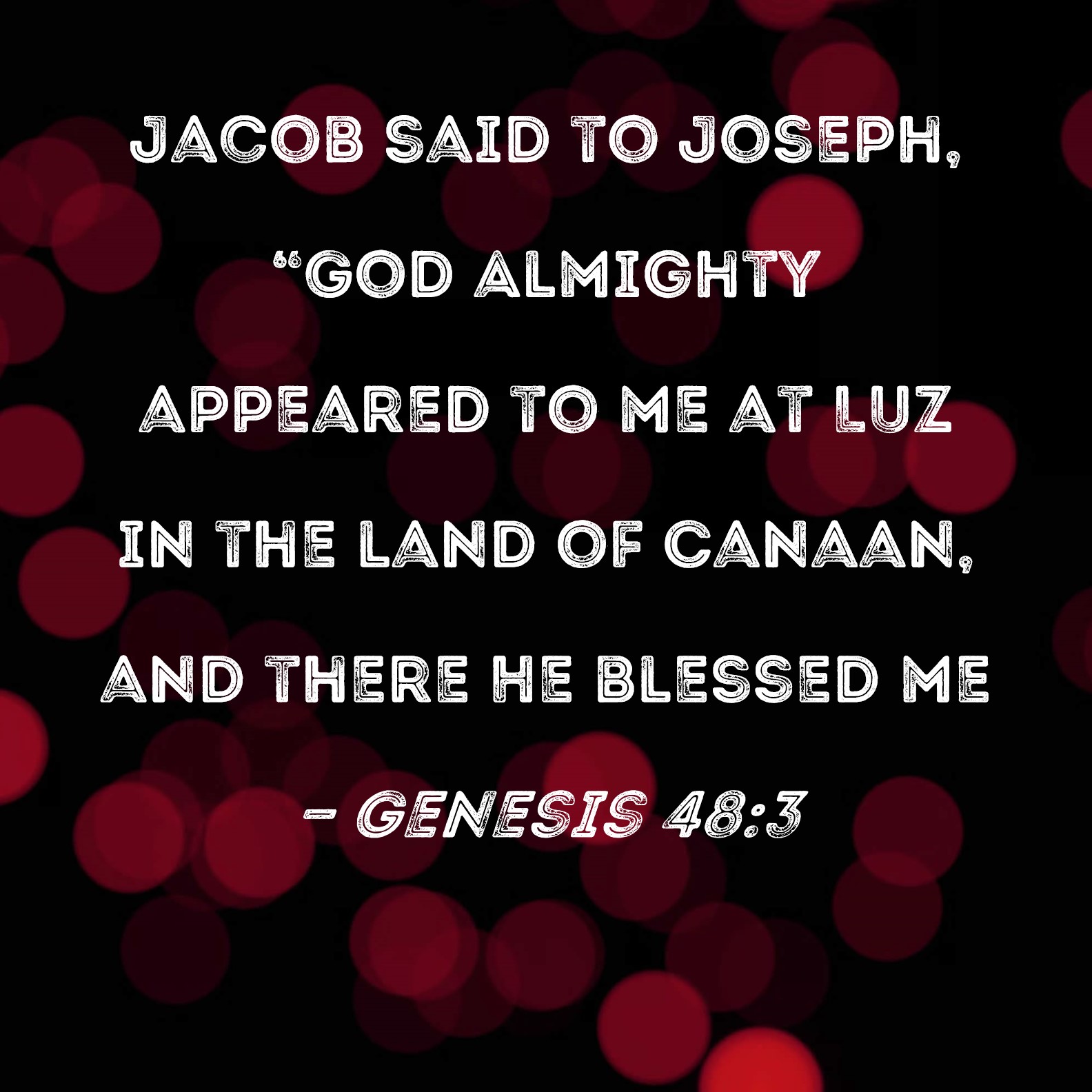 BSB: Jacob said to Joseph, "God Almighty appeared to me at Luz in the land of Canaan, and there He blessed me KJV: And Jacob said unto Joseph, God Almighty appeared unto me at Luz in the land of Canaan, and blessed me, DRB: And when Joseph was come in to him, he said : God Almighty appeared to me at Lute, which is in the land of Chanaan: and he blessed me, DBT: And Jacob said to Joseph, The Almighty God appeared to me at Luz in the land of Canaan, and blessed me, ERV: And Jacob said unto Joseph, God Almighty appeared unto me at Luz in the land of Canaan, and blessed me, WBT: And Jacob said to Joseph, God Almighty appeared to me at Luz, in the land of Canaan, and blessed me, WEB: Jacob said to Joseph, “God Almighty appeared to me at Luz in the land of Canaan, and blessed me, YLT: And Jacob saith unto Joseph, 'God Almighty hath appeared unto me, in Luz, in the land of Canaan, and blesseth me,Links Genesis 48:3 NIV • Genesis 48:3 NLT • Genesis 48:3 ESV • Genesis 48:3 NASB • Genesis 48:3 KJV • Genesis 48:3 Interlinear • Genesis 48:3 Commentaries • Genesis 48:3 Parallel Texts • Genesis 48:3 Bible Apps • Genesis 48:3 Parallel • Bible Hub |