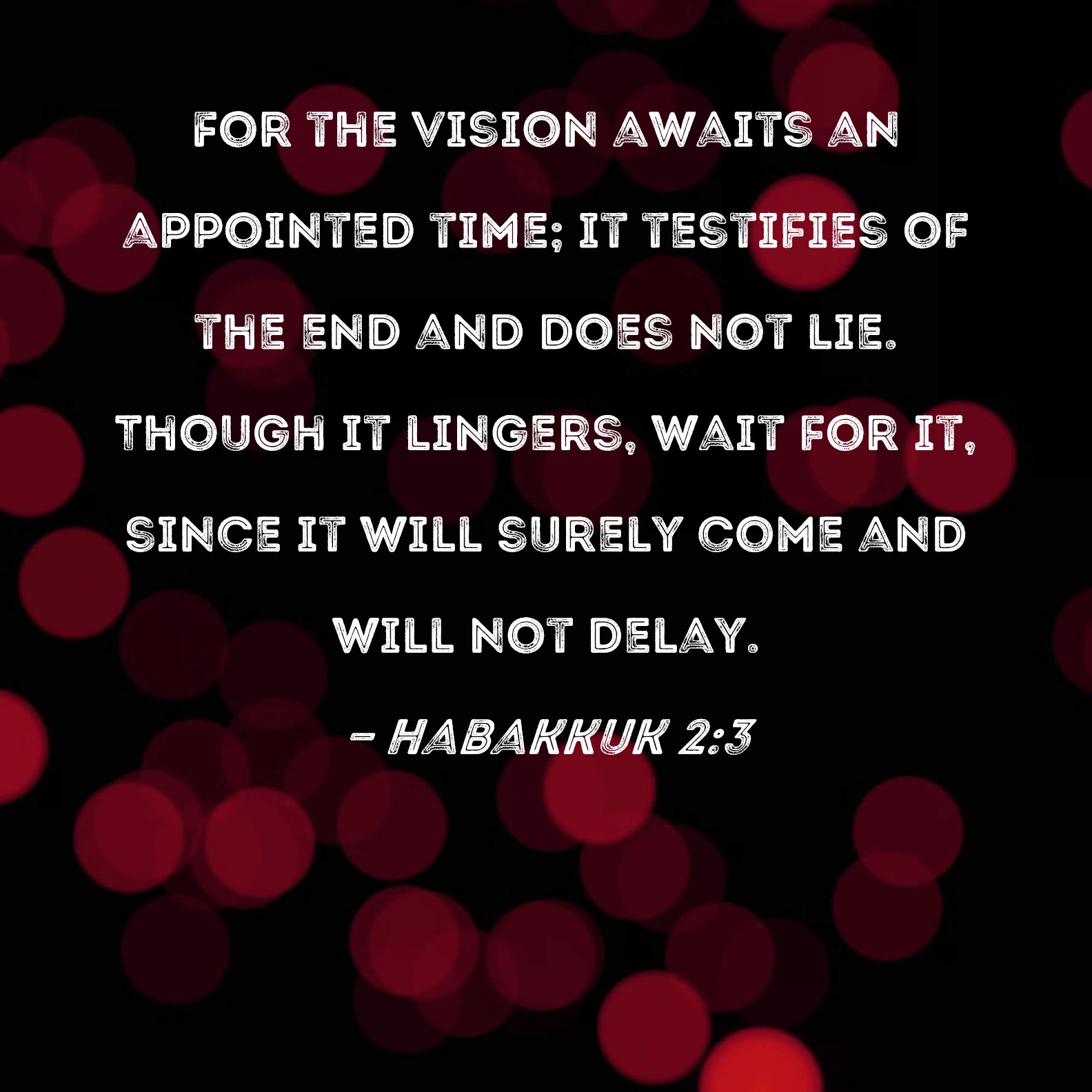 Habakkuk 2:3 For the vision awaits an appointed time; it testifies of the end and does not lie. Though it lingers, wait for it, since it will surely come and will not delay.