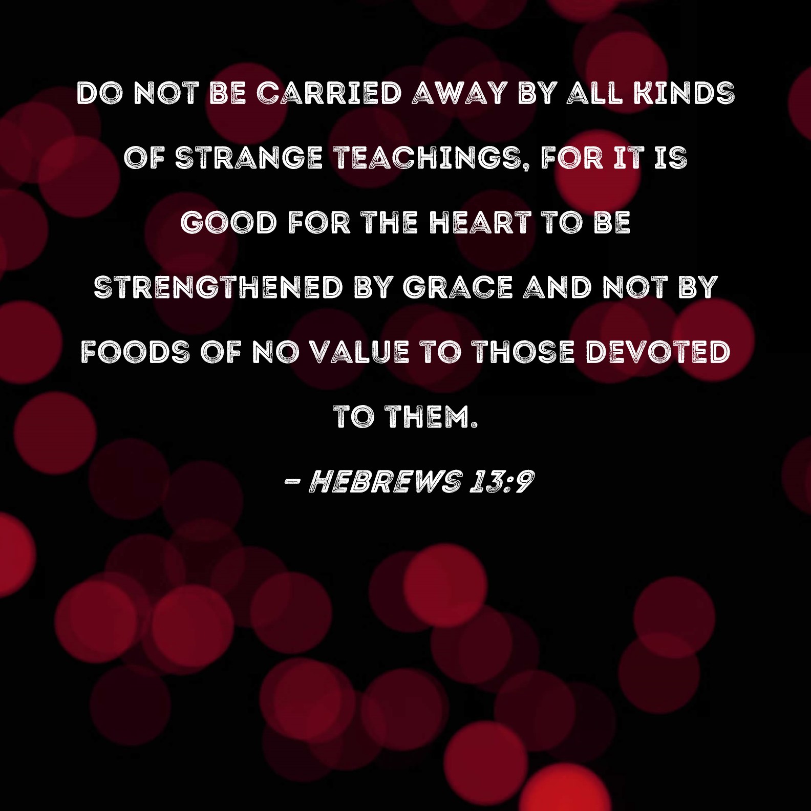 Hebrews 13:9 Do not be carried away by all kinds of strange teachings, for it is good for the heart to be strengthened by grace and not by foods of no value to those devoted to them.
