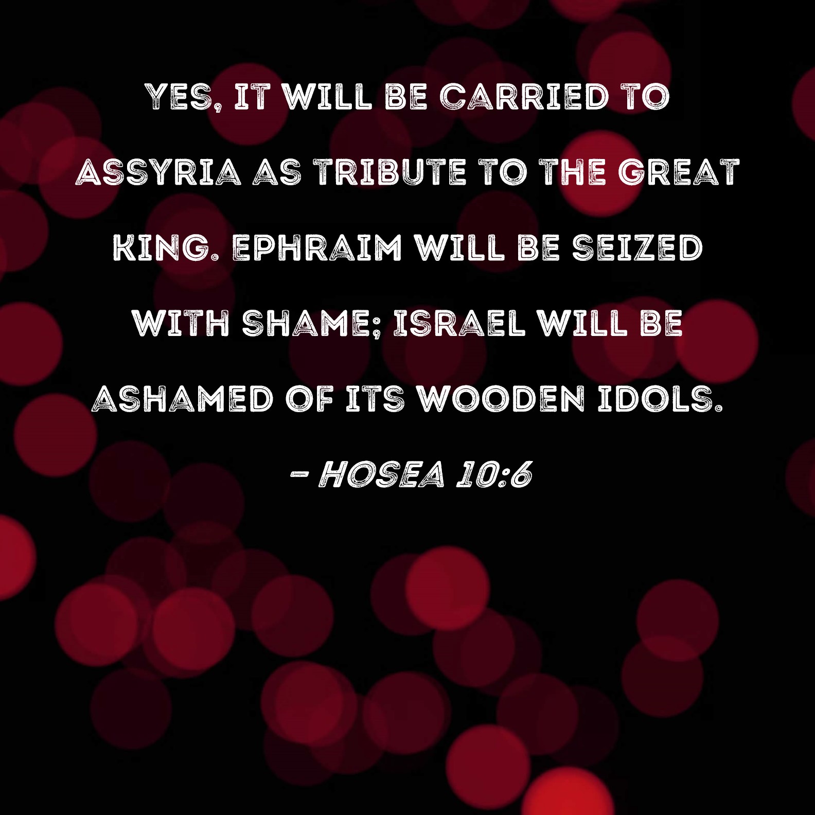 Hosea 10:6 Yes, it will be carried to Assyria as tribute to the great king. Ephraim will be seized with shame; Israel will be ashamed of its wooden idols.