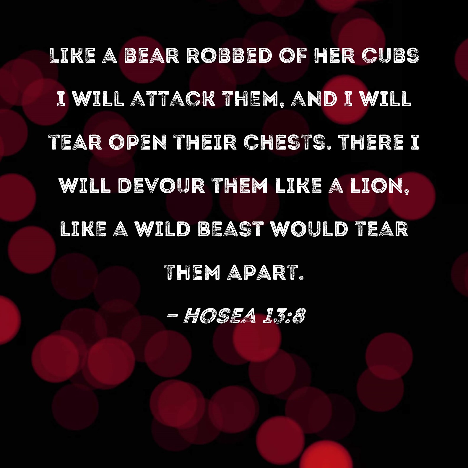Hosea 13:8 Like a bear robbed of her cubs I will attack them, and I will tear open their chests. There I will devour them like a lion, like a wild beast would tear them apart.