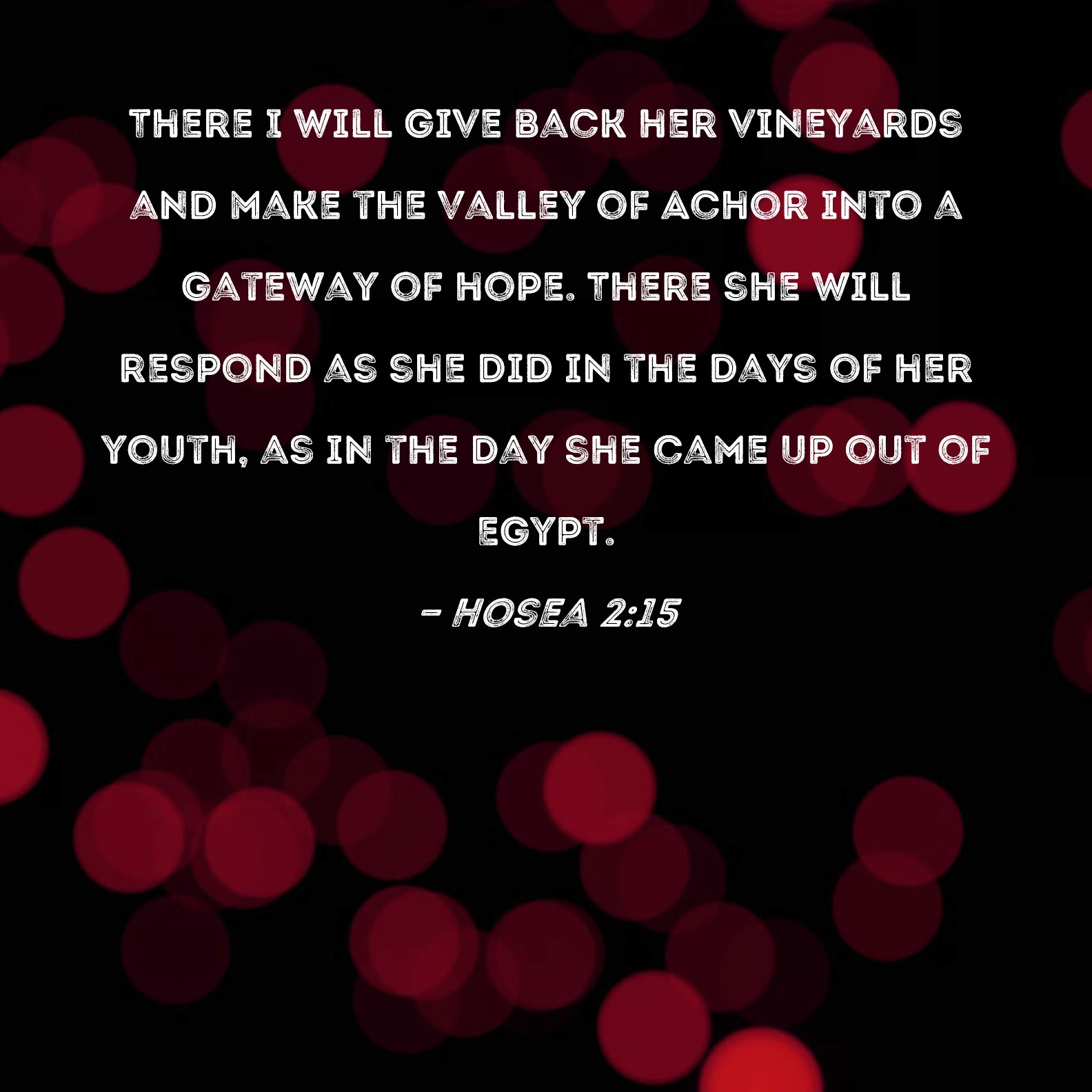 Hosea 2:15 There I will give back her vineyards and make the Valley of Achor into a gateway of hope. There she will respond as she did in the days of her youth, as in the day she came up out of Egypt.