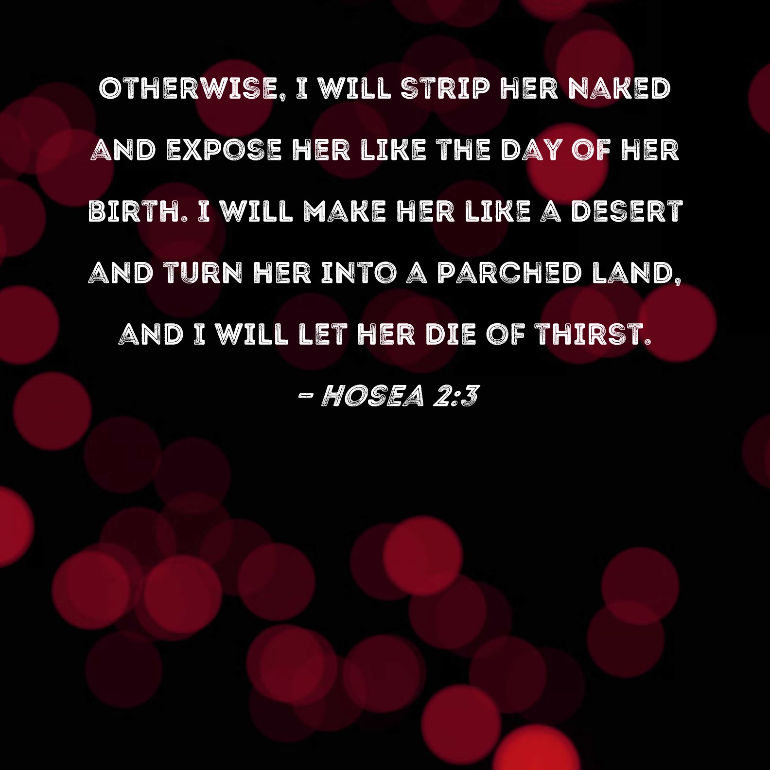 Hosea 2:3 Otherwise, I will strip her naked and expose her like the day of her birth. I will make her like a desert and turn her into a parched land, and I will let her die of thirst.