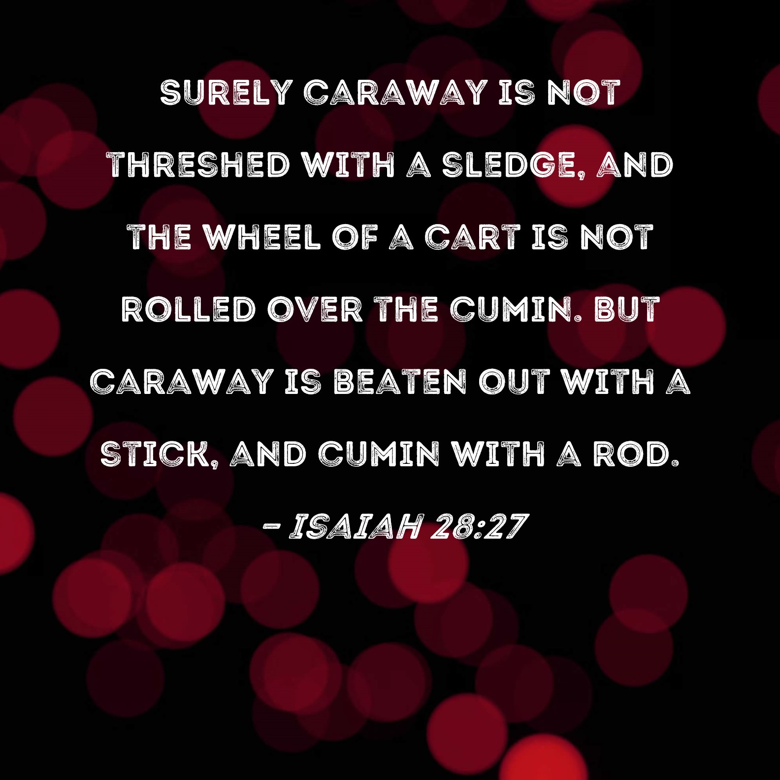 Isaiah 28:27 Surely caraway is not threshed with a sledge, and the wheel of a cart is not rolled over the cumin. But caraway is beaten out with a stick, and cumin with a rod.
