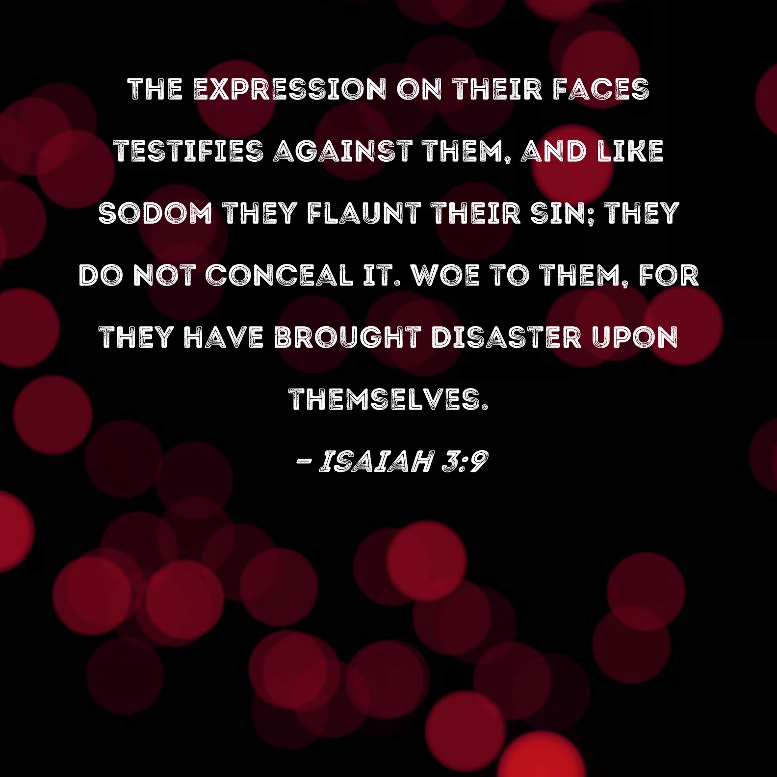 Isaiah 3:9 The expression on their faces testifies against them, and like Sodom they flaunt their sin; they do not conceal it. Woe to them, for they have brought disaster upon themselves.