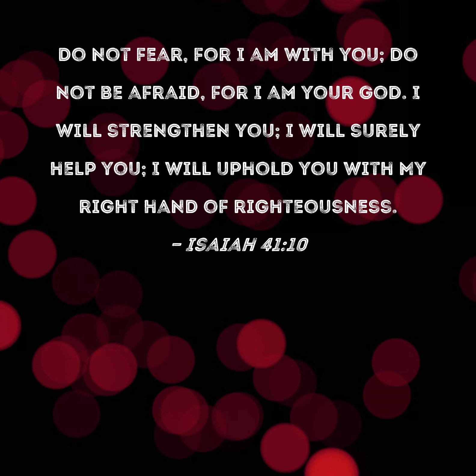 Isaiah 41:10 Do not fear, for I am with you; do not be afraid, for I am your God. I will strengthen you; I will surely help you; I will uphold you with My right hand of righteousness.