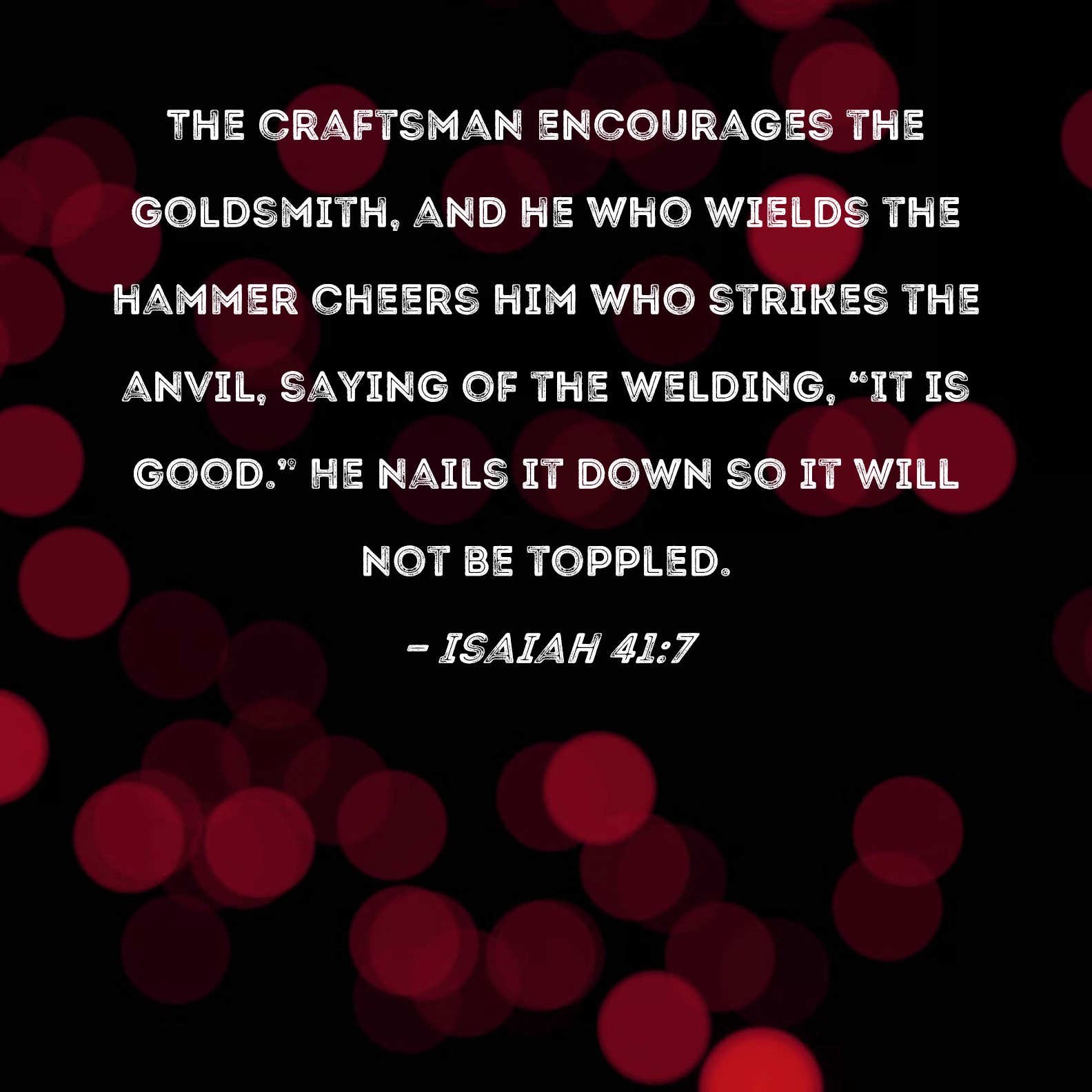 Isaiah 41:7 The craftsman encourages the goldsmith, and he who wields the hammer cheers him who strikes the anvil, saying of the welding, "It is good." He nails it down so it will not be toppled.