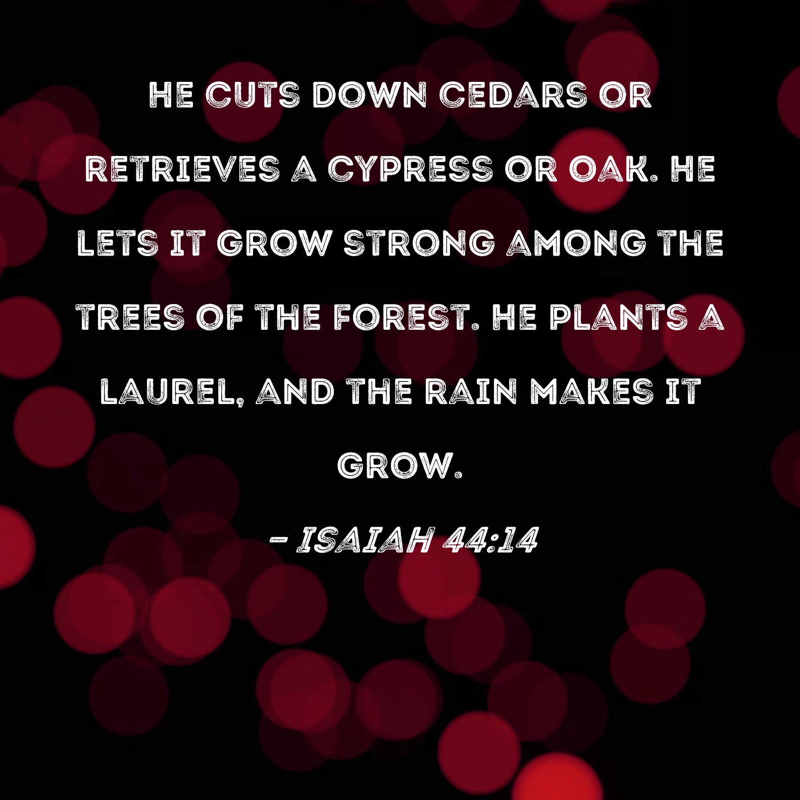 Isaiah 44:14 He cuts down cedars or retrieves a cypress or oak. He lets it grow strong among the trees of the forest. He plants a laurel, and the rain makes it grow.