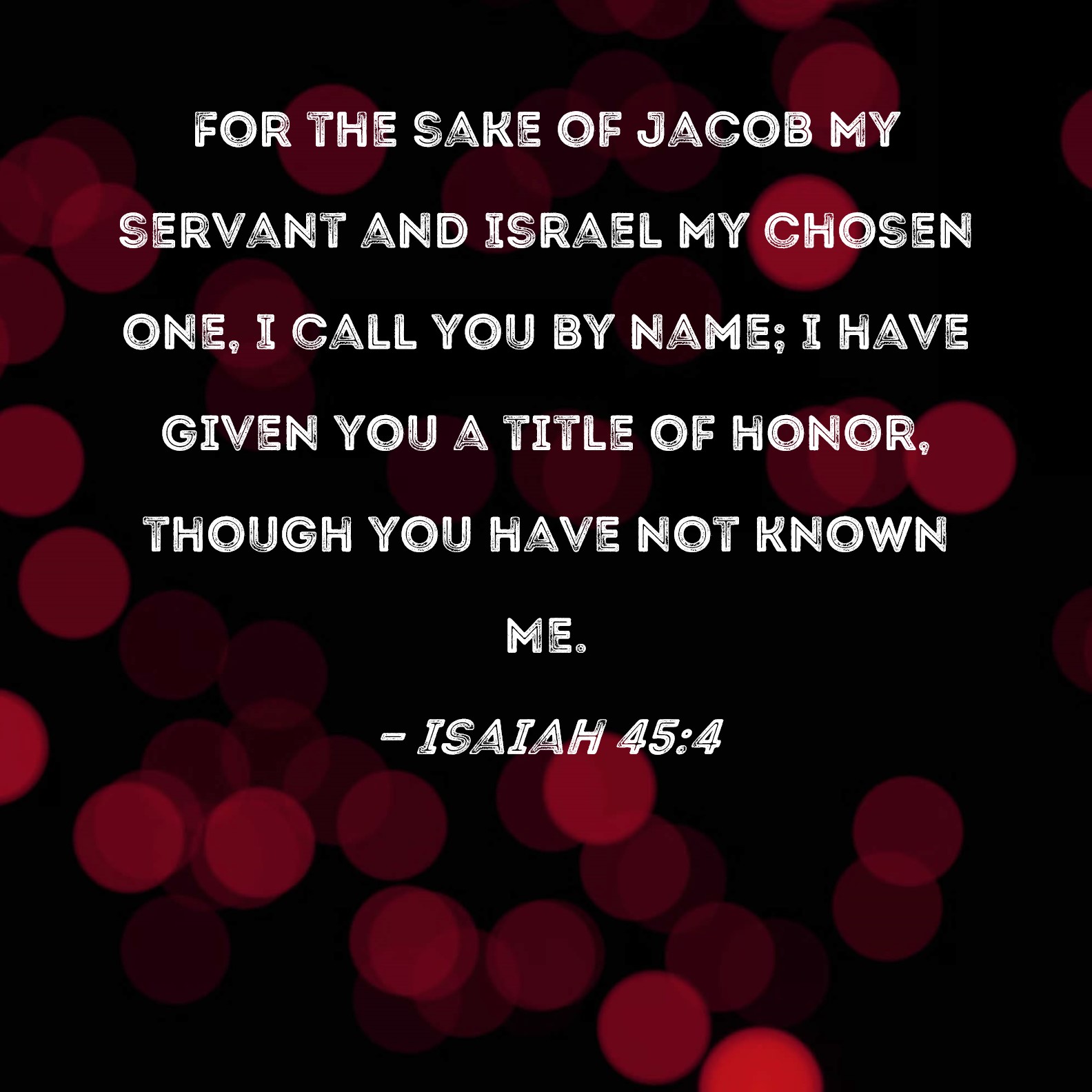 BSB: For the sake of Jacob My servant and Israel My chosen one, I call you by name; I have given you a title of honor, though you have not known Me. KJV: For Jacob my servant's sake, and Israel mine elect, I have even called thee by thy name: I have surnamed thee, though thou hast not known me. DRB: For the sake of my servant Jacob, and Israel my elect, I have even called thee by thy name: I have made a likeness of thee, and thou hast not known me. DBT: For Jacob my servant's sake, and Israel mine elect, I have called thee by thy name; I surnamed thee, though thou didst not know me; ERV: For Jacob my servant's sake, and Israel my chosen, I have called thee by thy name: I have surnamed thee, though thou hast not known me. WBT: For Jacob my servant's sake, and Israel my elect, I have even called thee by thy name: I have surnamed thee, though thou hast not known me: WEB: For Jacob my servant’s sake, and Israel my chosen, I have called you by your name. I have given you a title, though you have not known me. YLT: For the sake of my servant Jacob, And of Israel My chosen, I call also thee by thy name, I surname thee, And thou hast not known Me.Links Isaiah 45:4 NIV • Isaiah 45:4 NLT • Isaiah 45:4 ESV • Isaiah 45:4 NASB • Isaiah 45:4 KJV • Isaiah 45:4 Interlinear • Isaiah 45:4 Commentaries • Isaiah 45:4 Parallel Texts • Isaiah 45:4 Bible Apps • Isaiah 45:4 Parallel • Bible Hub |