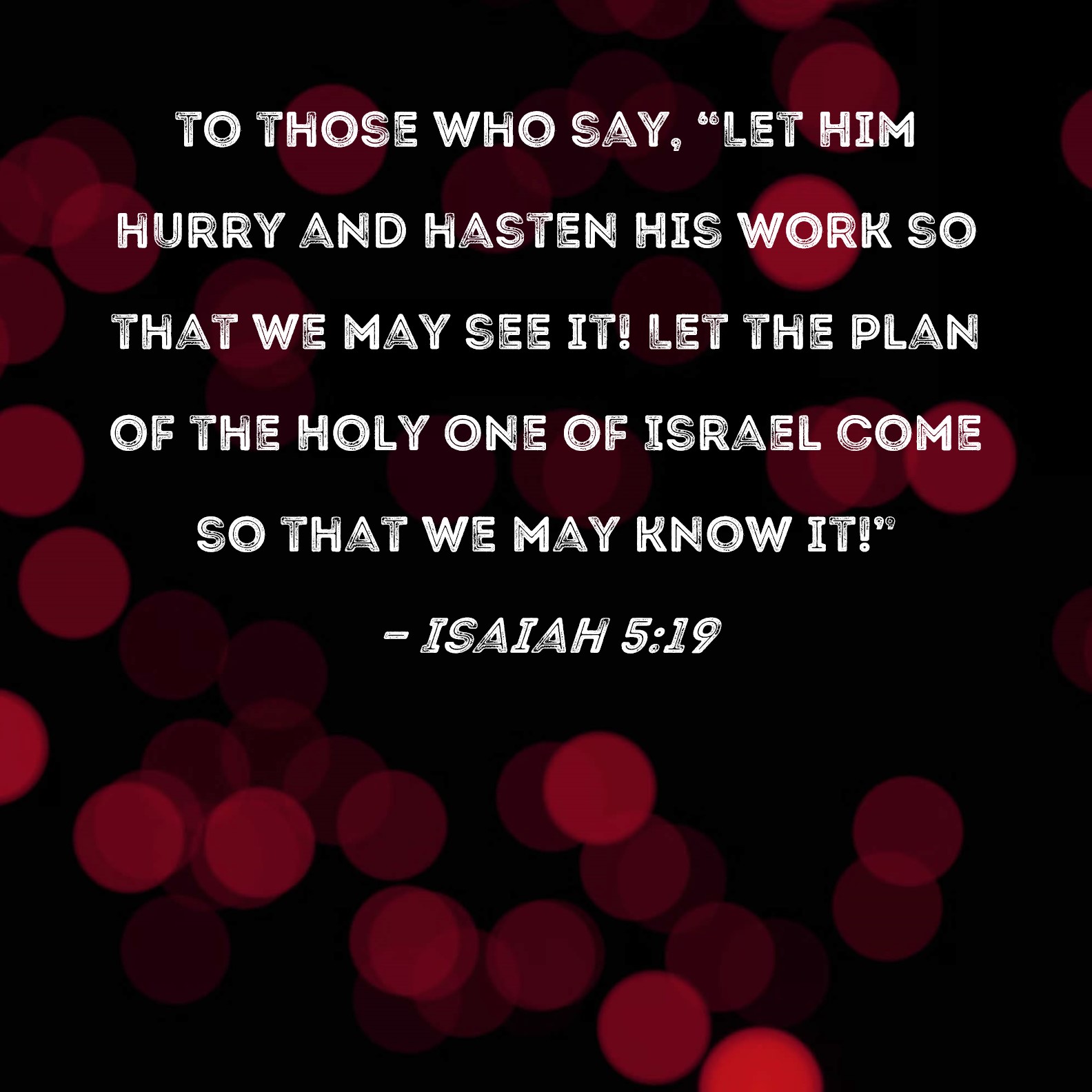 Isaiah 5:19 to those who say, "Let Him hurry and hasten His work so that we may see it! Let the plan of the Holy One of Israel come so that we may know it!"